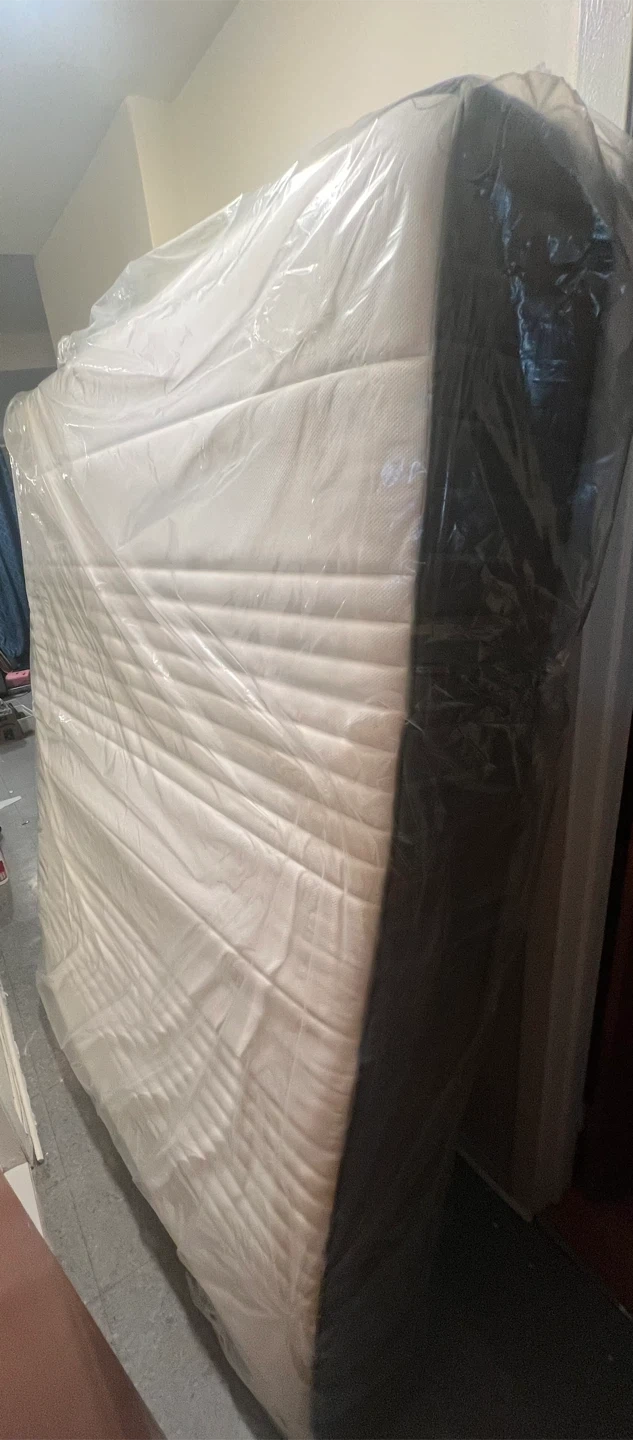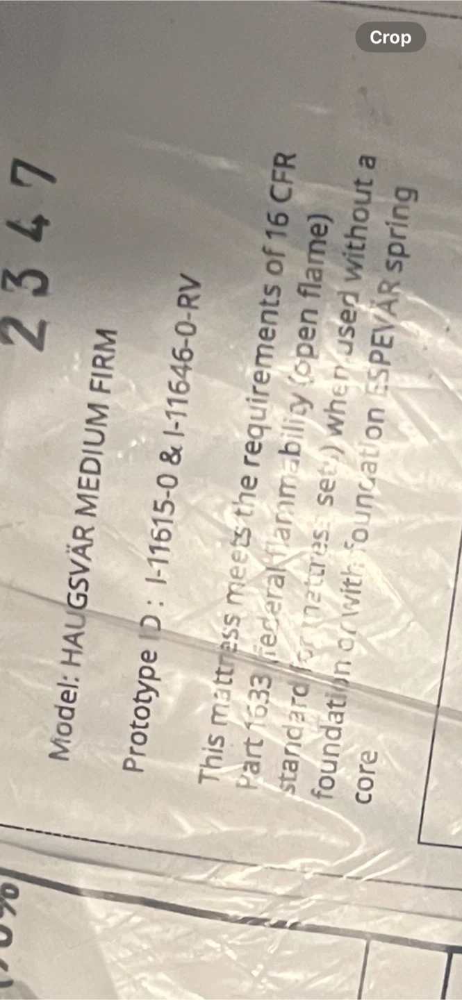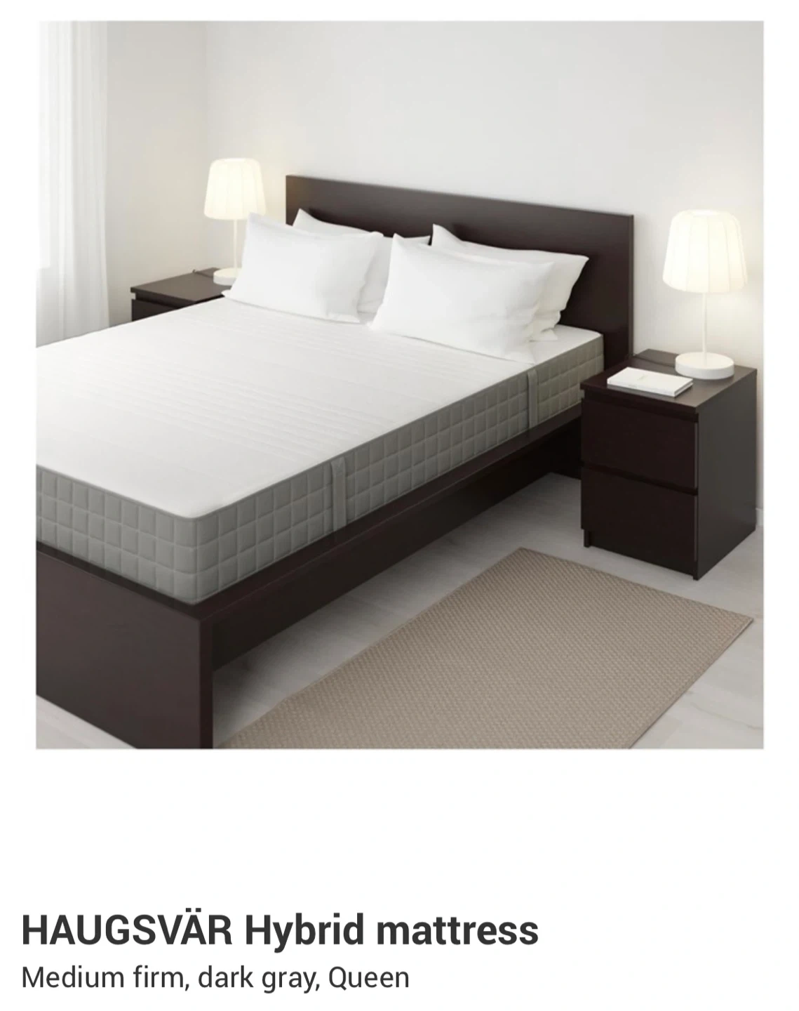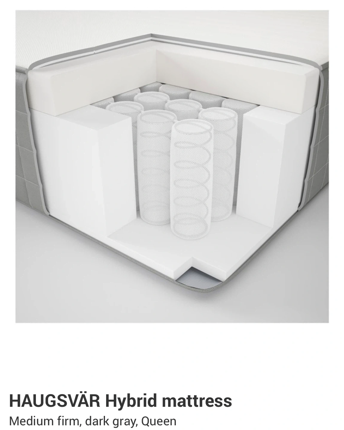 This is an IKEA HAUGSVAR Hybrid mattress. It's a Queen size in dark gray and medium firm. The mattress meets flammability standards.