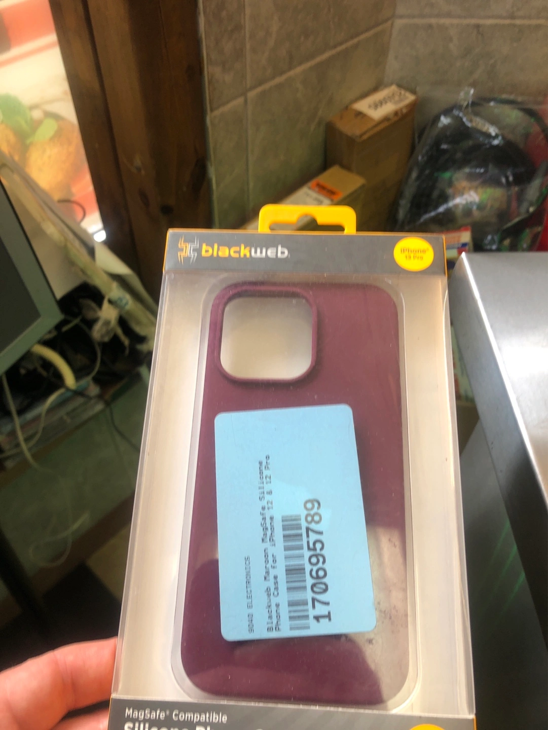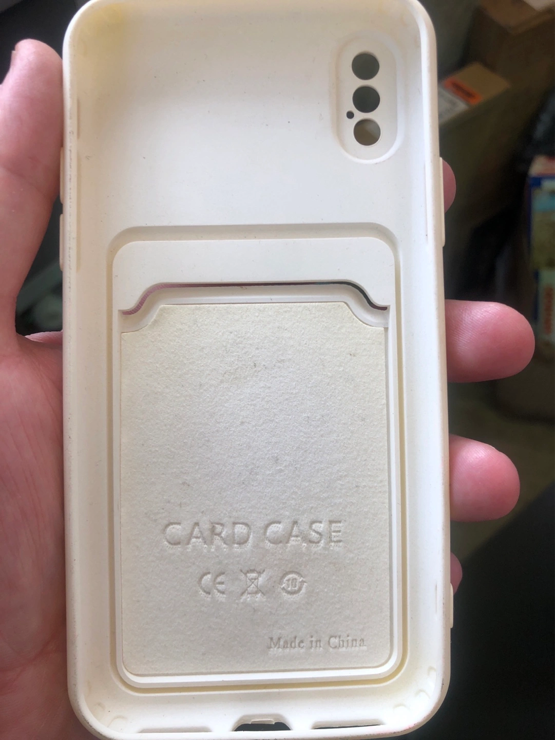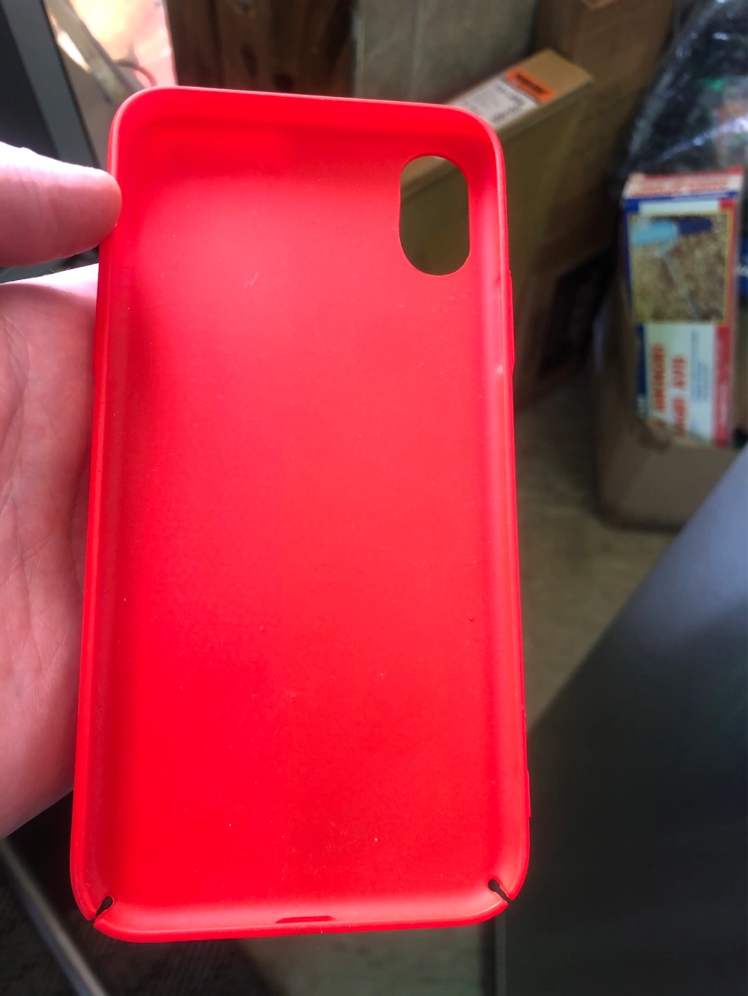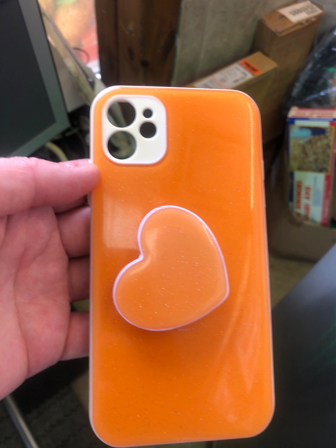 Five iPhone cases, various colours and styles. Includes a purple MagSafe compatible case, an orange case with a heart-shaped pop socket, a white card case, a pink case, and a red case. All appear to be new or gently used.