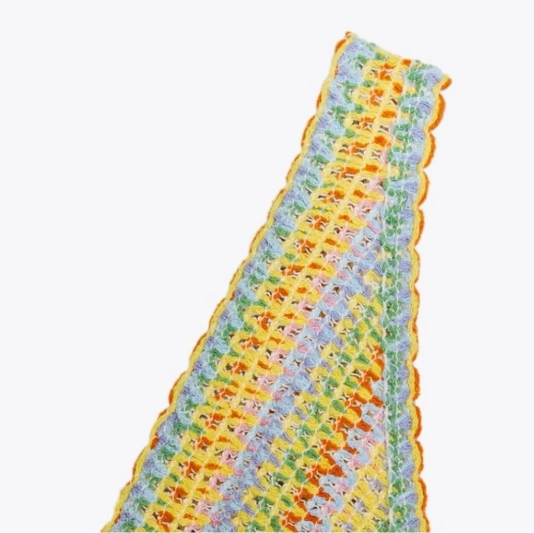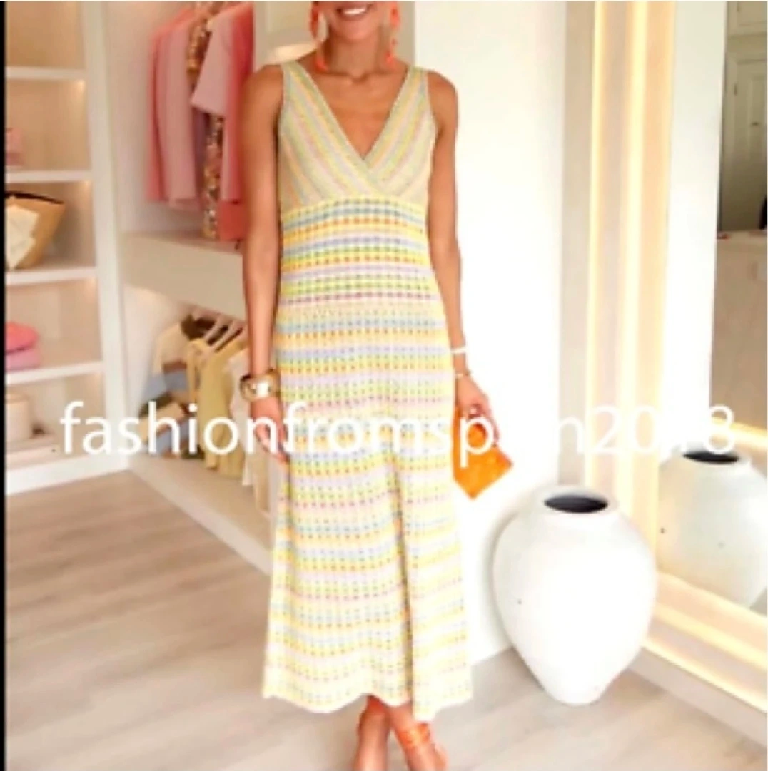 Elevate your summer wardrobe with this gorgeous, sold-out Zara crochet knit midi dress. Featuring a vibrant yet soft pastel multi-stripe pattern in shades of yellow, blue, pink, and orange, this piece is the ultimate vacation staple.