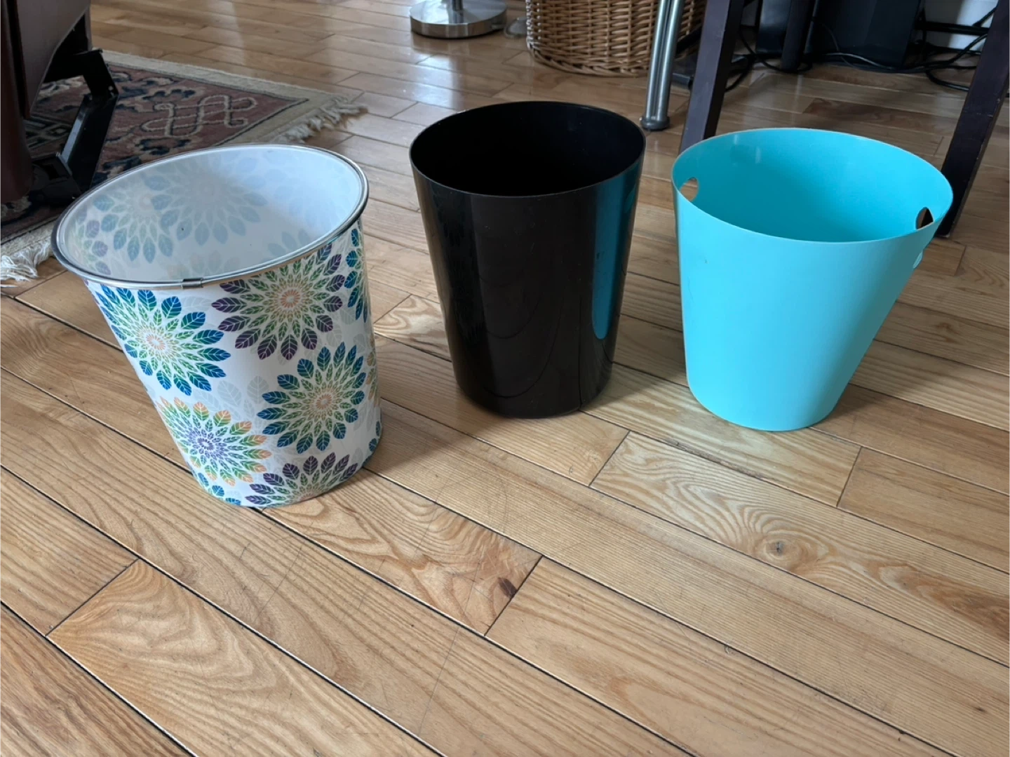Set of 3 Small Trash Cans - White Floral, Black, and Blue