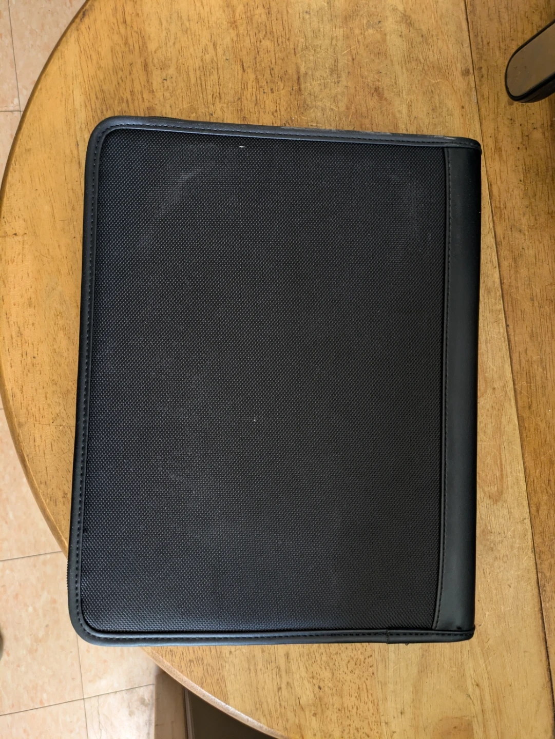 This Samsonite portfolio organizer is black and features a textured front with faux leather trim. It zips closed and includes an interior notepad, pen slot, card slots, and a zippered pocket. It's great for meetings or travel!