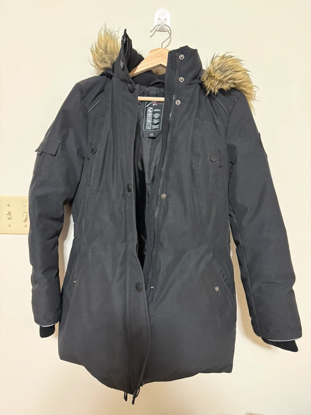This black winter parka features a faux fur-lined hood and a durable shell. It's designed for cold weather with a full zip and button closure. Keep warm and stylish this season!