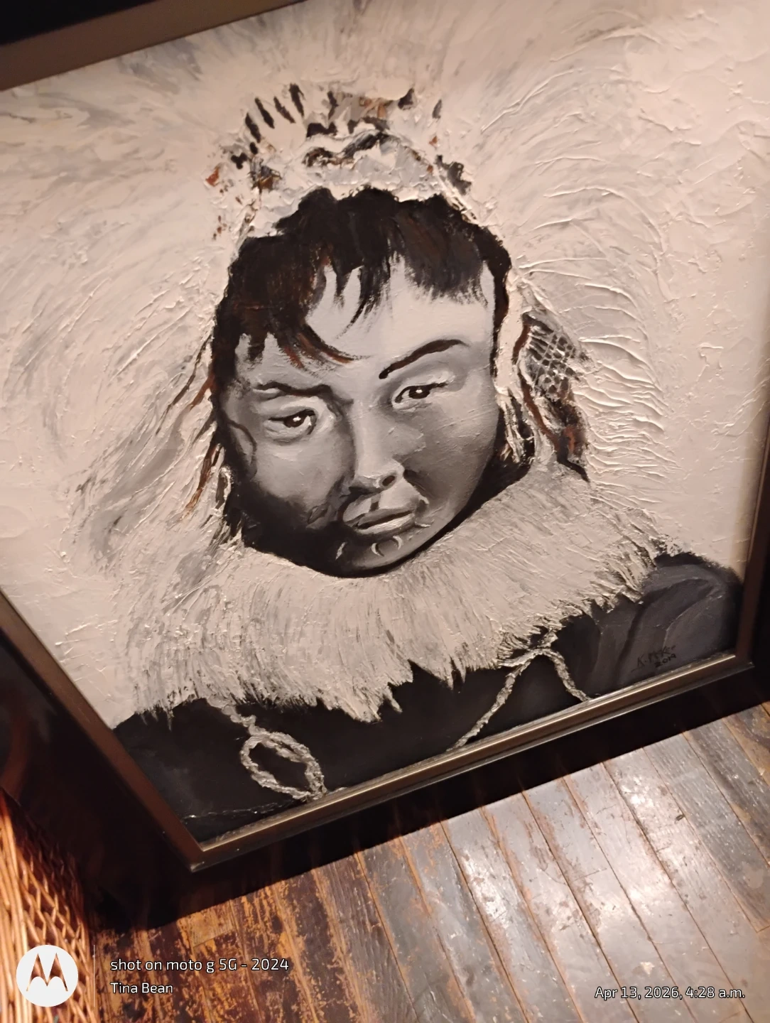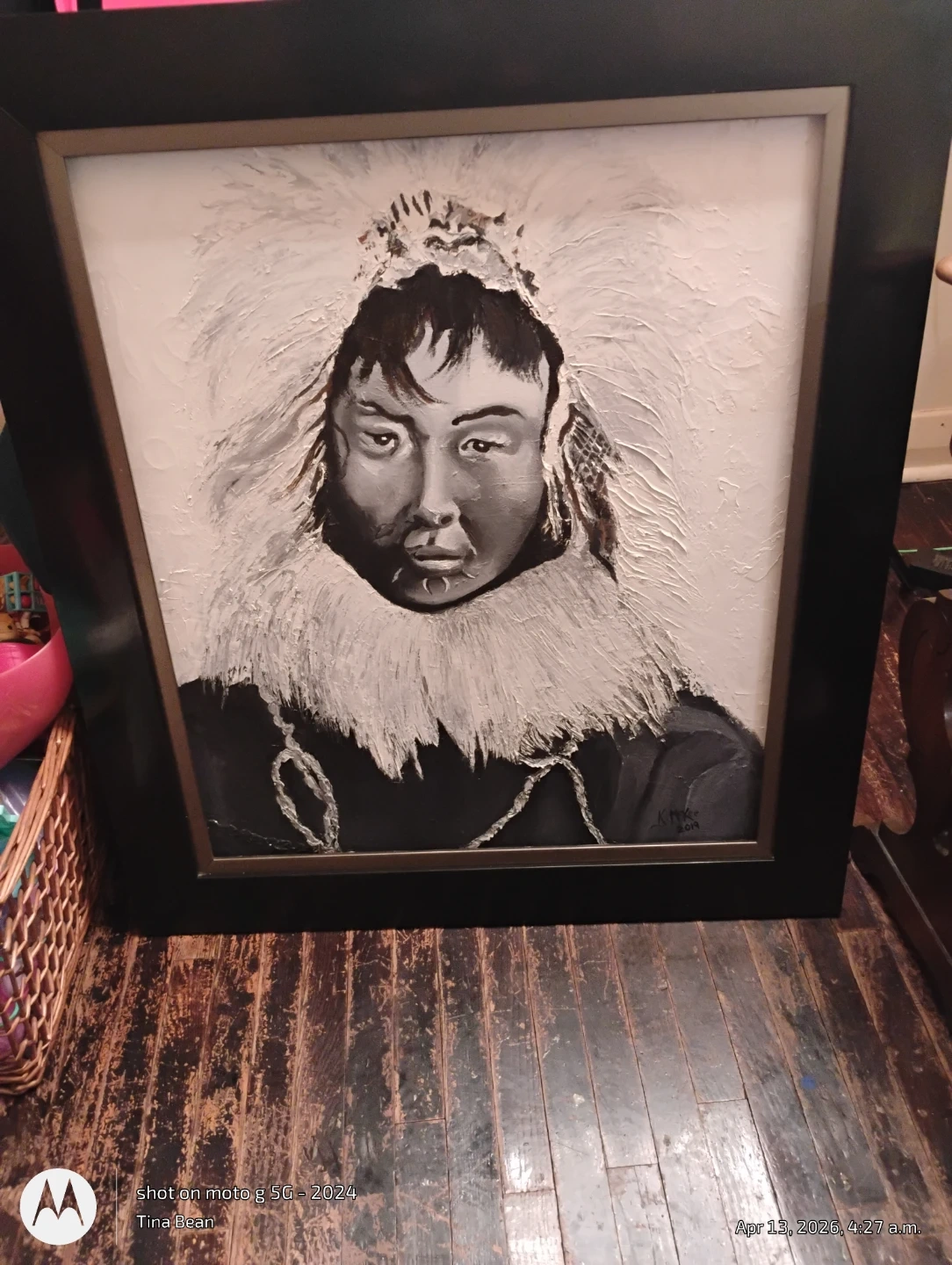 Framed oil painting "Inuit Fisherman " A young man adorned in traditional winter wear. The artwork uses a monochromatic palette with textured details. It's signed by the artist K.. McKee. Adds a unique touch to any space!