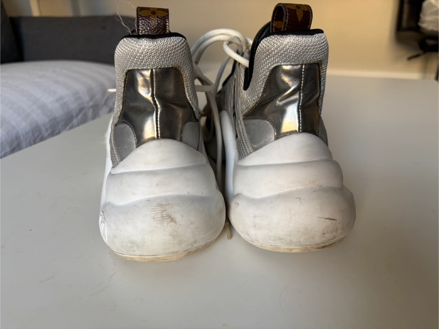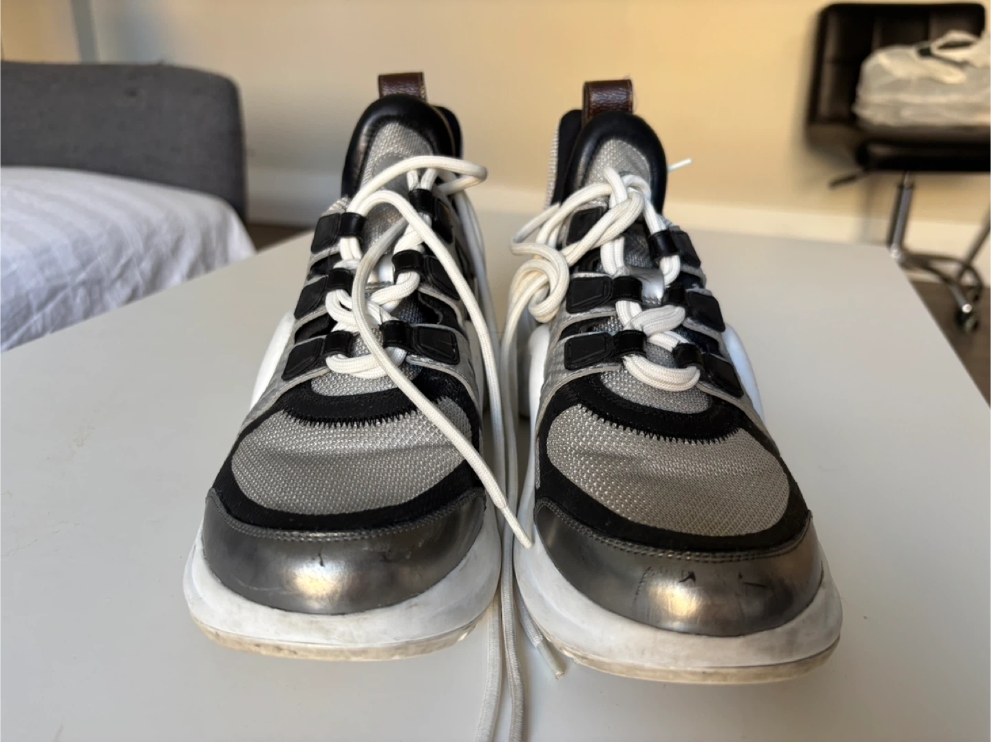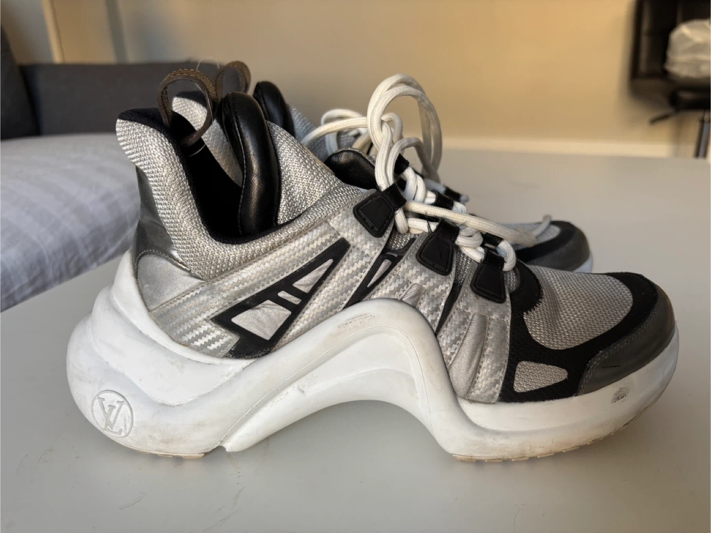 Louis Vuitton Archlight sneakers in silver and black. These statement shoes feature a chunky white sole and signature LV branding. They're a unique addition to any footwear collection!