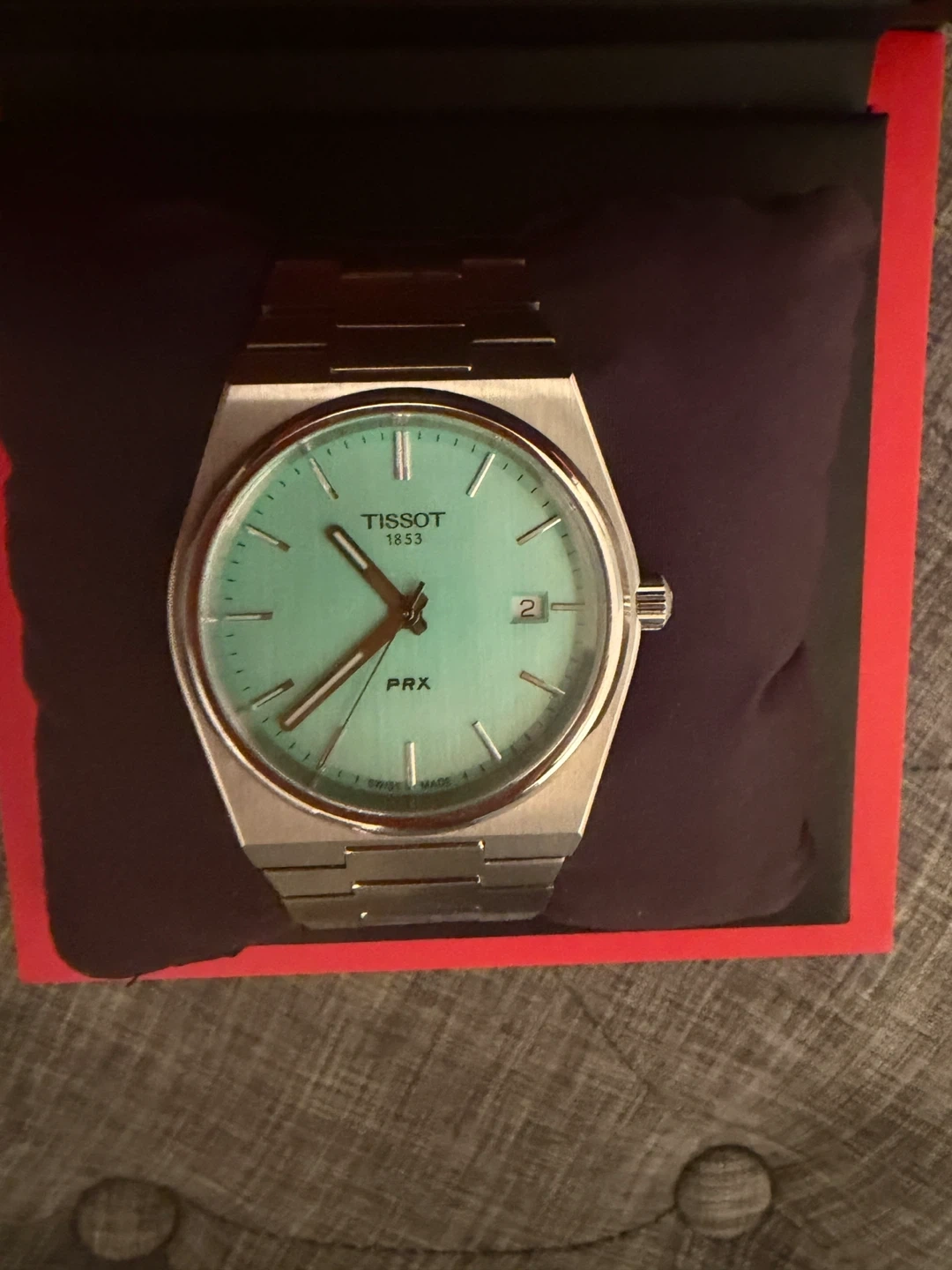 A Tissot PRX watch with a mint green dial. Includes original box and packaging. Quartz movement with date function. Barely used. Available with Box, tags, extra link, cards etc. Prostine condition