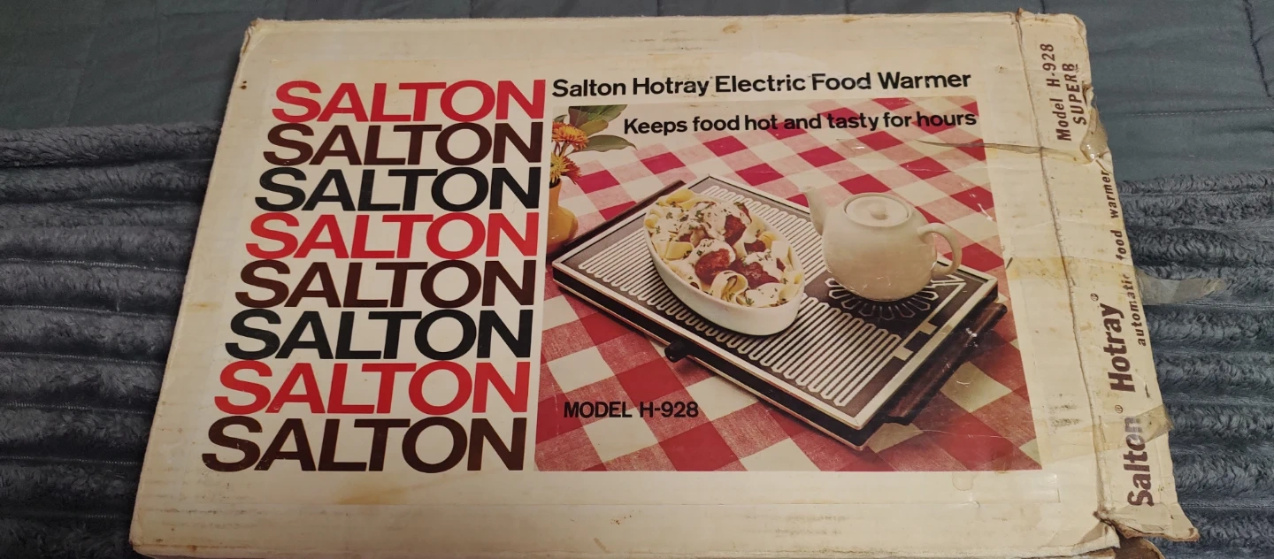 Selling a vintage Salton Hotray electric food warmer, model H-928. It comes with the original box. This hot tray is perfect for keeping food hot and tasty for hours. It was made here in the Bronx!!