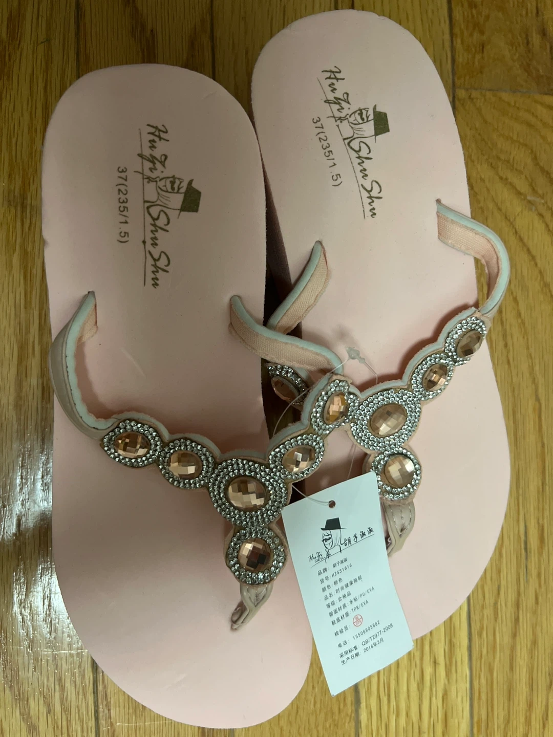 Hugi Shu Shu pink flip-flops with a jeweled strap. Features PU/EVA upper and TPR/EVA sole. Size 37 (US 6.5 equivalent).