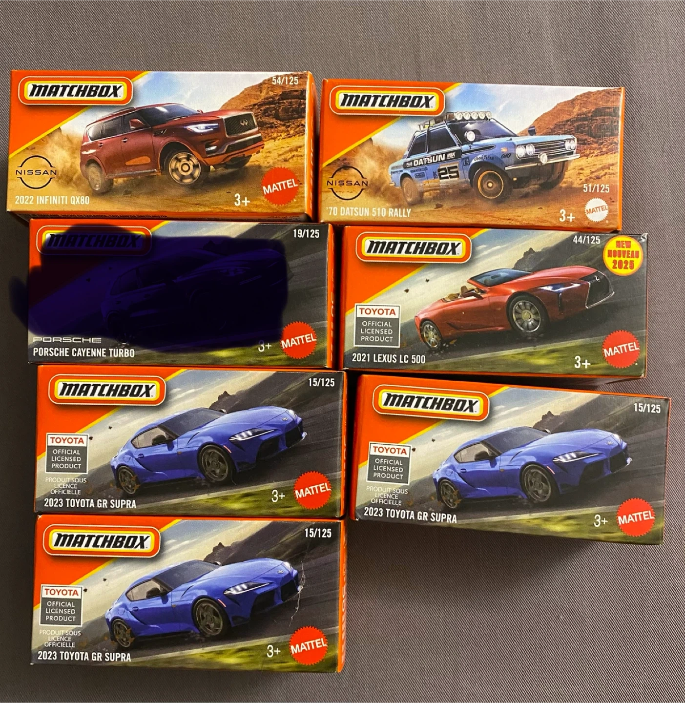 including a 2022 Infiniti QX80, '70 Datsun 510 Rally, 2021 Lexus LC 500, and 2023 Toyota GR Supras. All are officially licensed products.