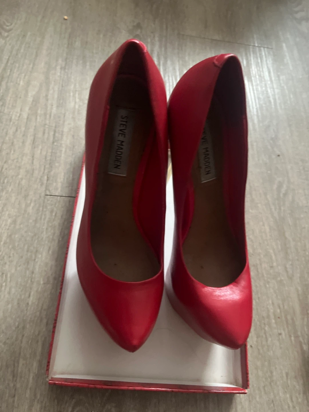 These striking red heels are from Steve Madden. They feature a bold gold stiletto heel. Perfect for adding a pop of color to any outfit!
