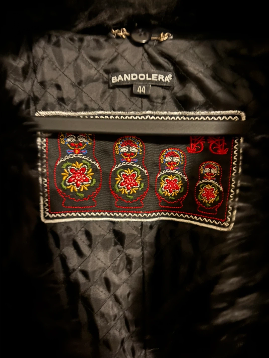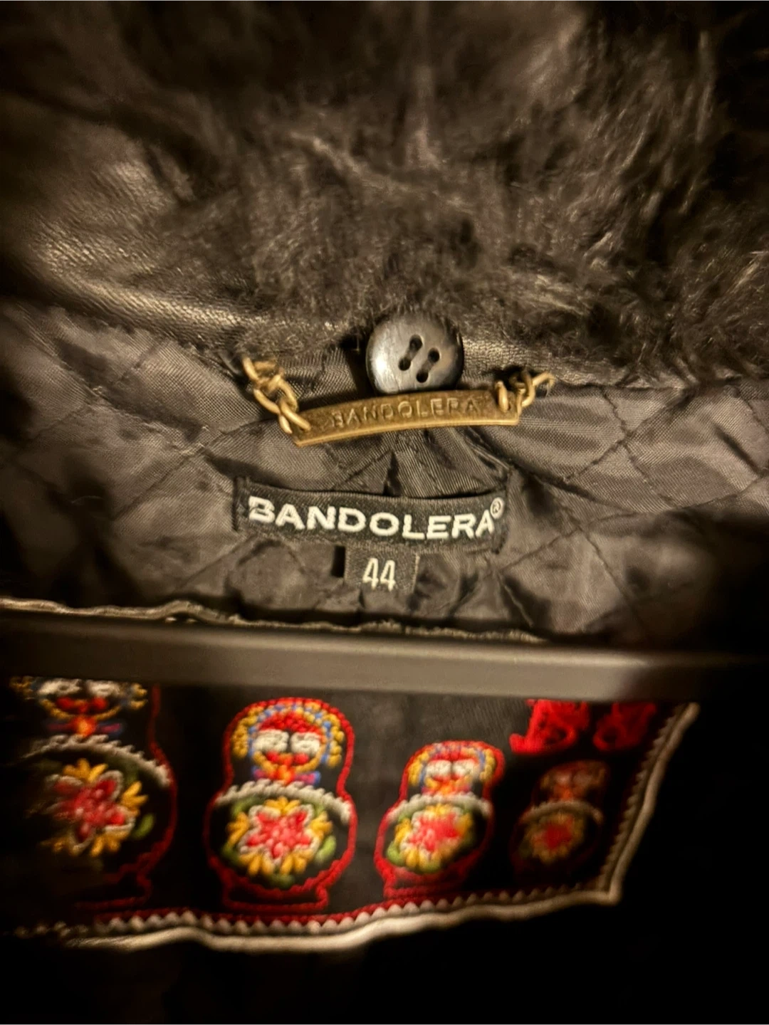 Selling a stylish Bandolera black leather jacket. It's a size 44 and features a unique design with fur trim and decorative stitching. Perfect for adding a touch of flair to your wardrobe!