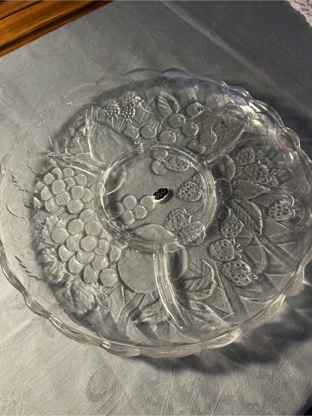 Selling a lovely vintage P&G glass divided serving dish! It features a beautiful fruit pattern and is perfect for serving snacks or appetizers at your next gathering. It is in good condition and ready for a new home