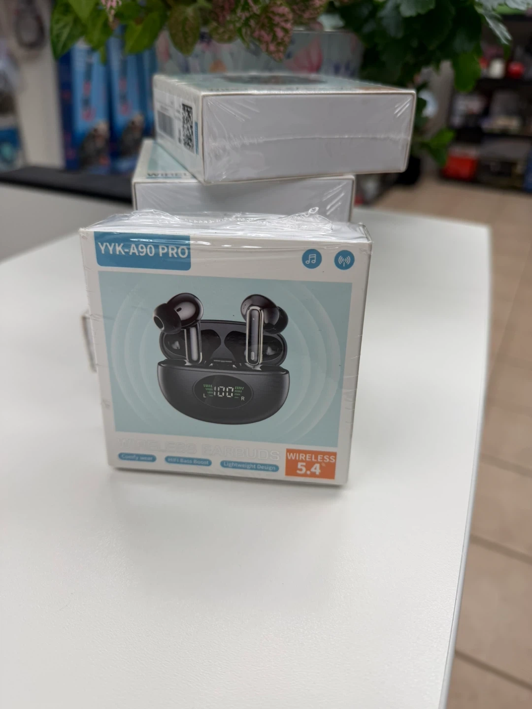 Introducing the YYK-A90 Pro wireless earbuds with Bluetooth 5.4. These earbuds offer a 1.5h charging time and a 51g weight. They come with a charging case, two headphones, a Type-C charging cable, and a namesake.Sealed box.