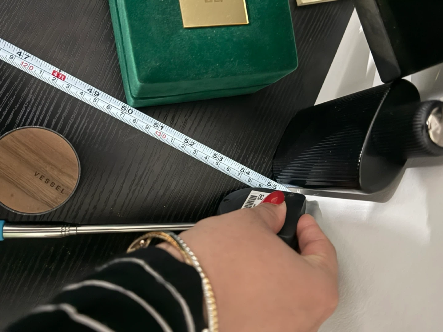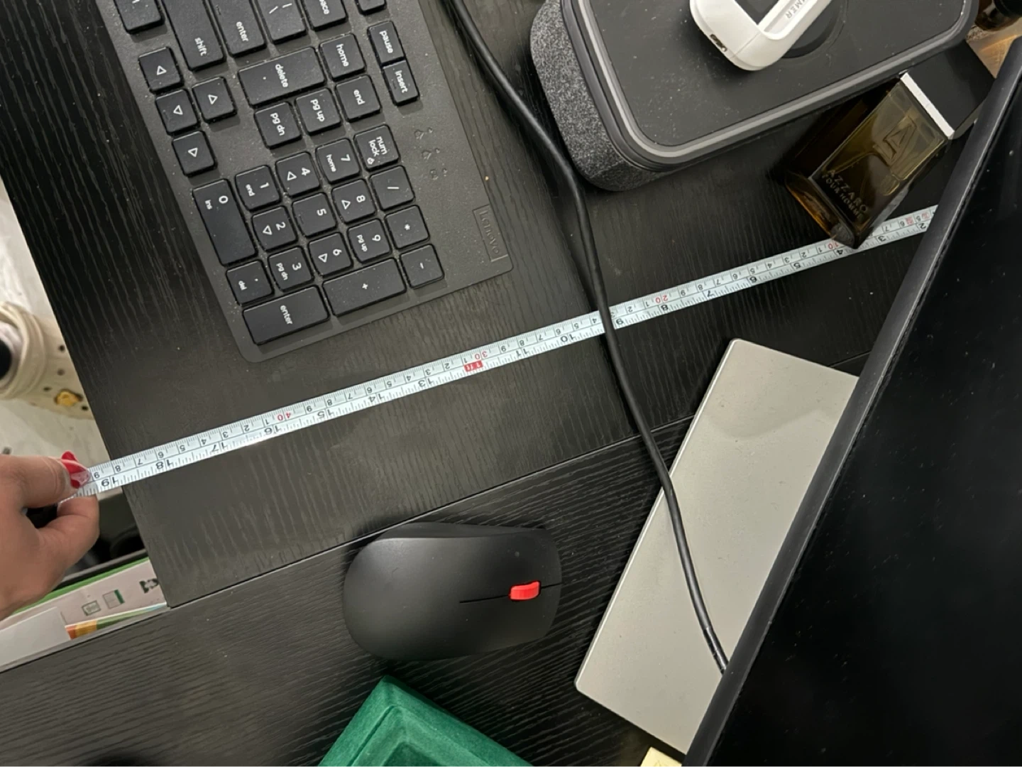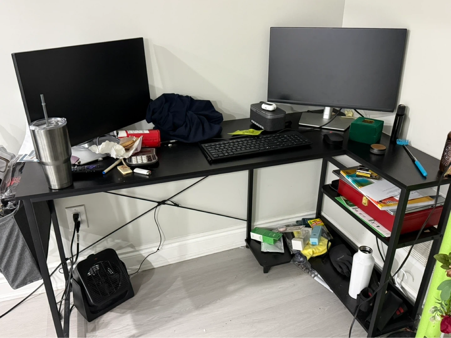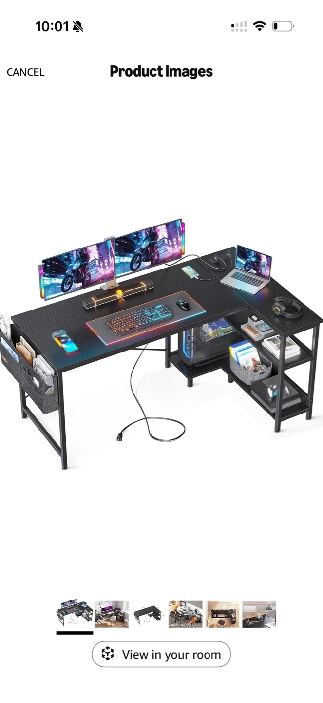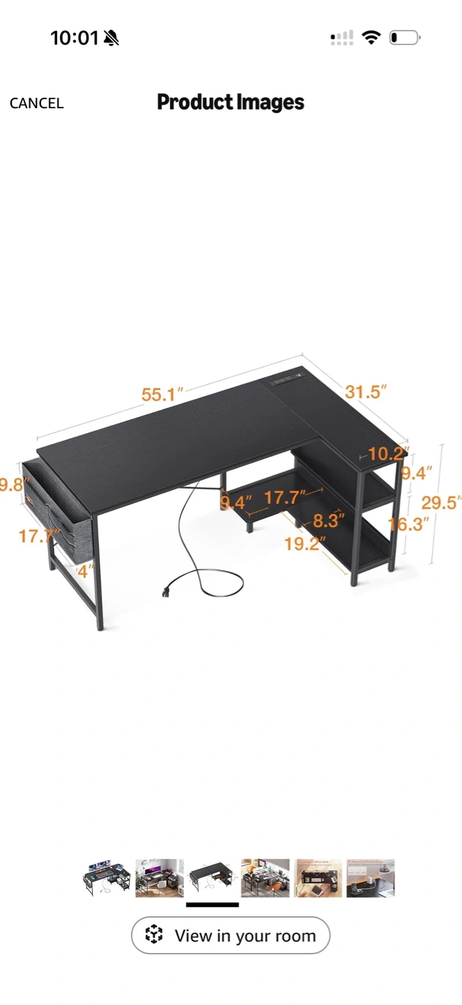This L-shaped desk measures 55.1" on the long side and 31.5" on the short side. It features built-in shelving on the corner section. The desk is black and includes a fabric organizer on one side.