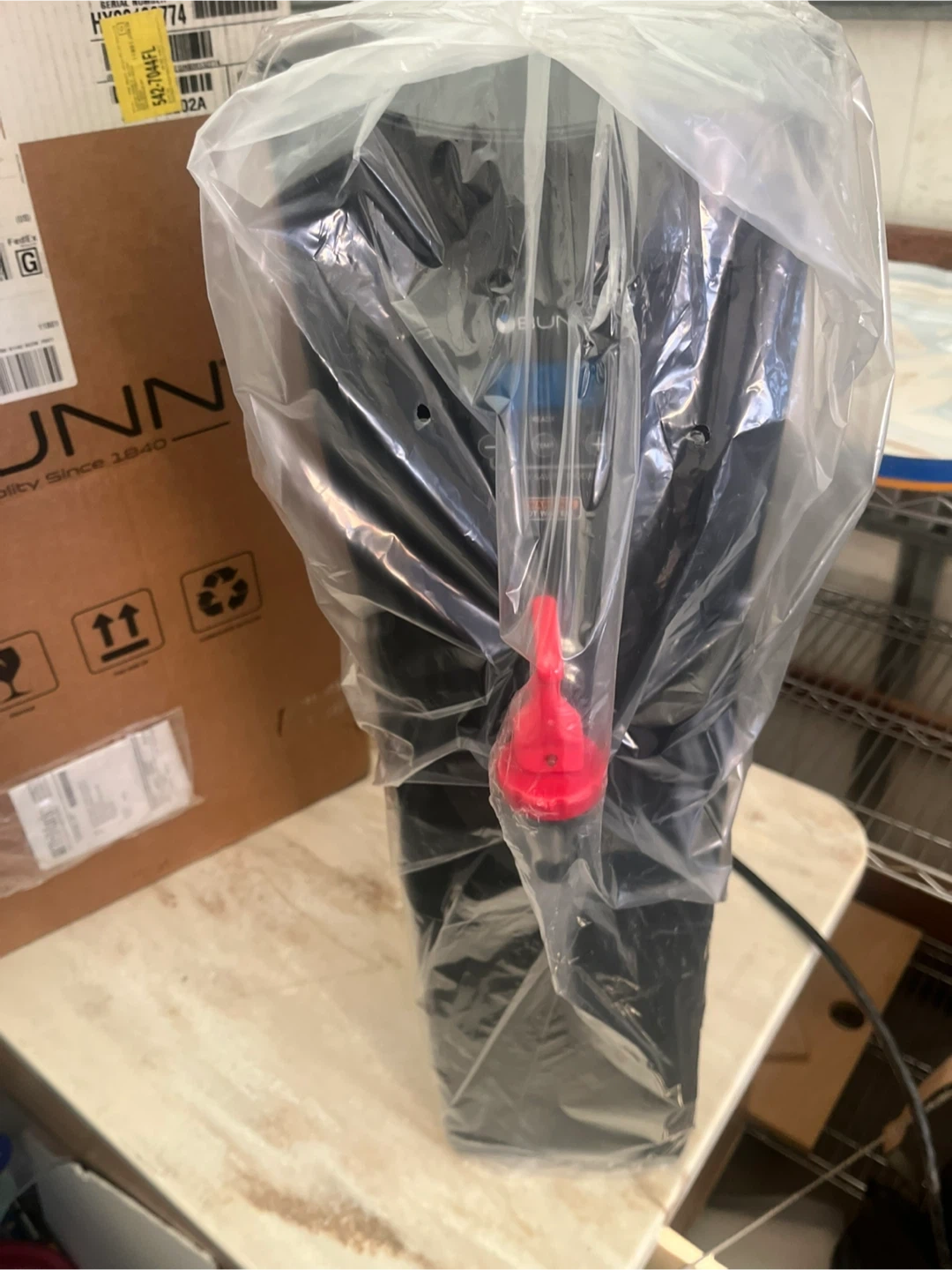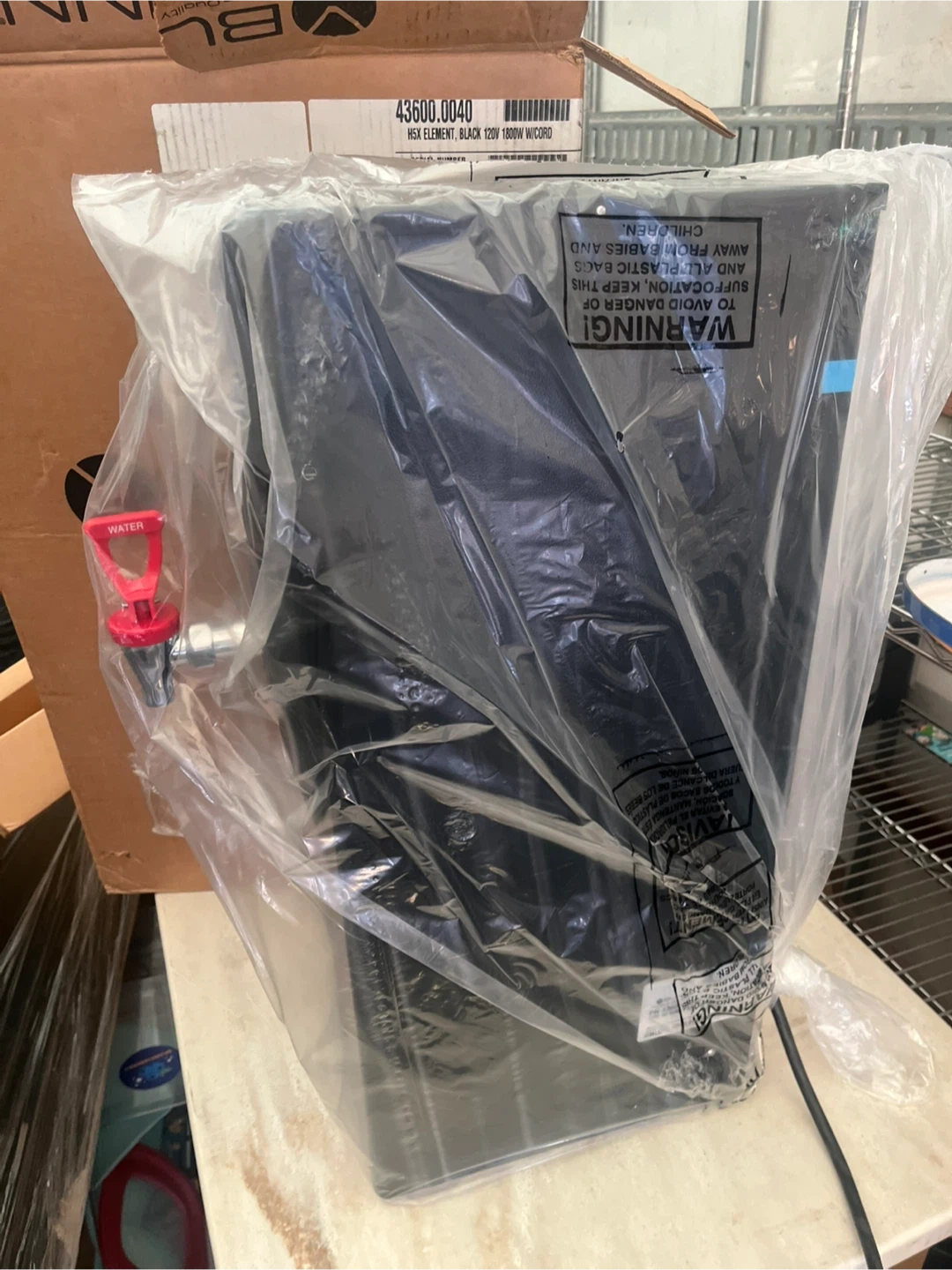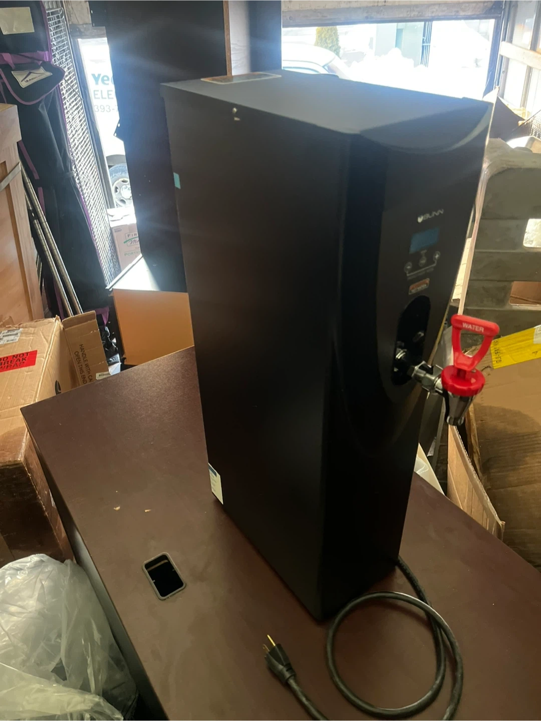 This is a BUNN H5X Element water dispenser in black. It has a built-in faucet for easy dispensing. It's designed for countertop use. Ready for your kitchen or office!