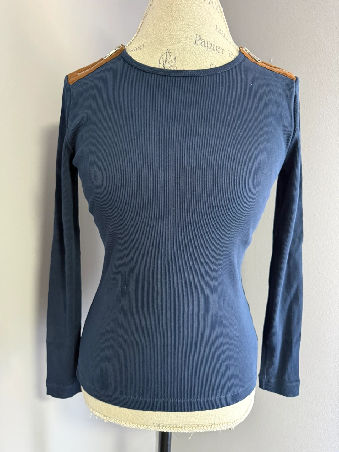 This is a navy blue, long-sleeved ribbed top from Ralph Lauren. It's a size small. The shoulders have decorative zipper details.