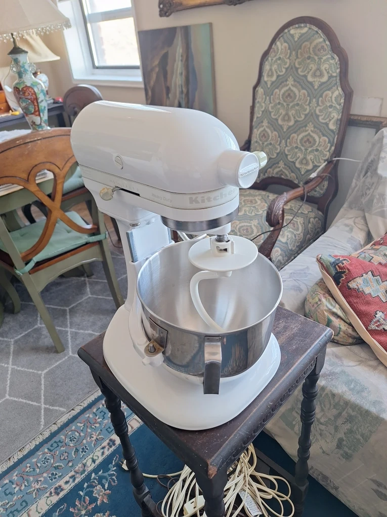 This is a white KitchenAid stand mixer. It includes a stainless steel bowl and whisk attachment. This mixer's a kitchen essential for baking and cooking!