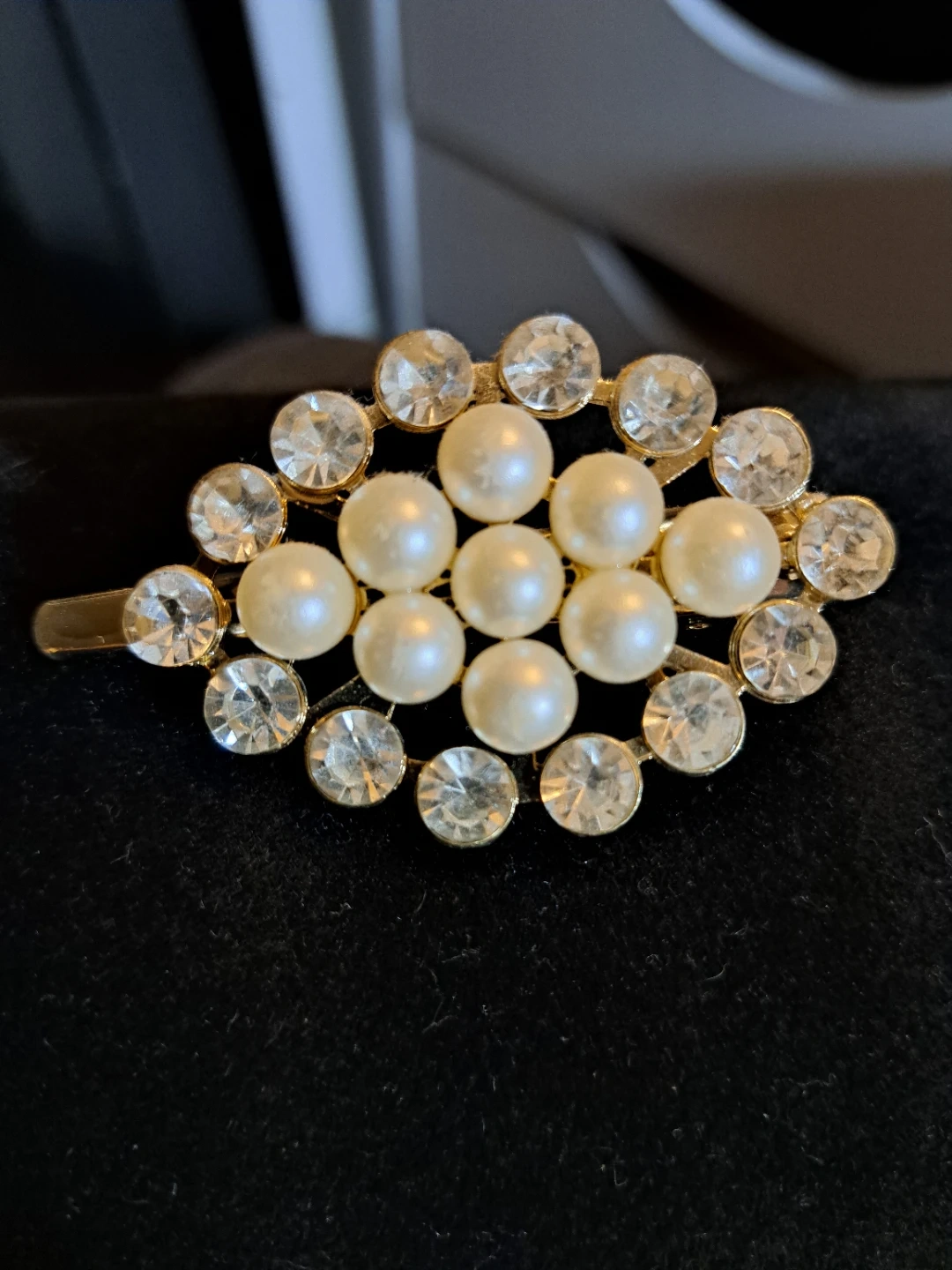 This hair clip features a cluster of faux pearls surrounded by clear rhinestones. The metal clip is gold-tone. It's a lovely accent for hairstyles! Or where on a coat