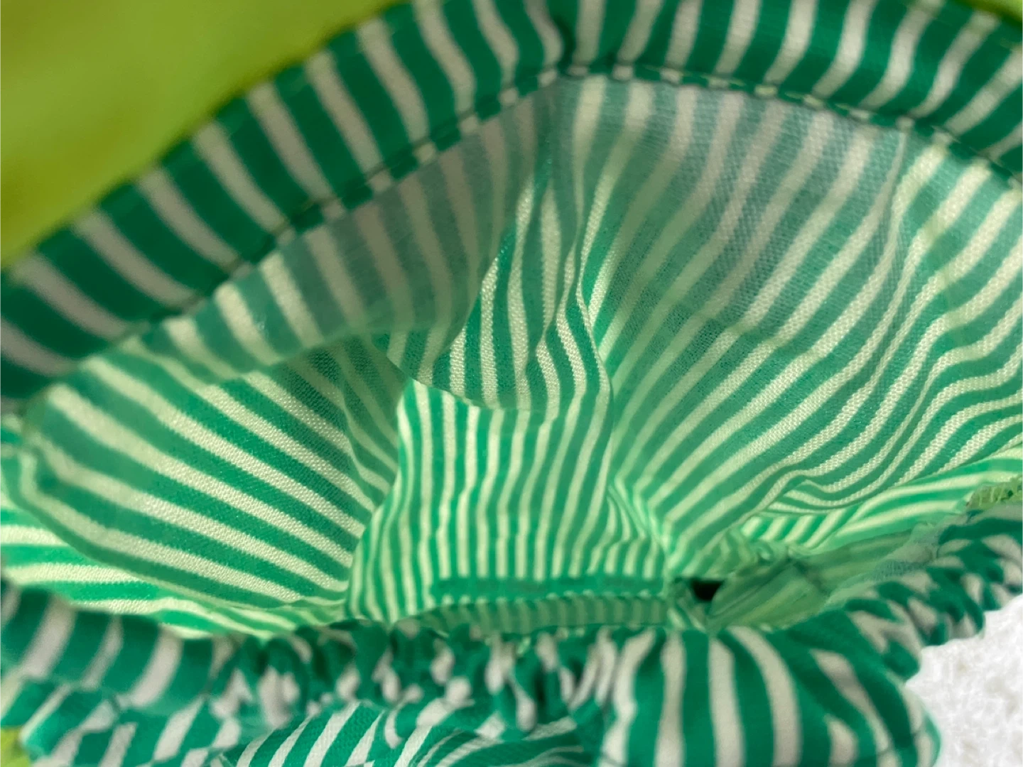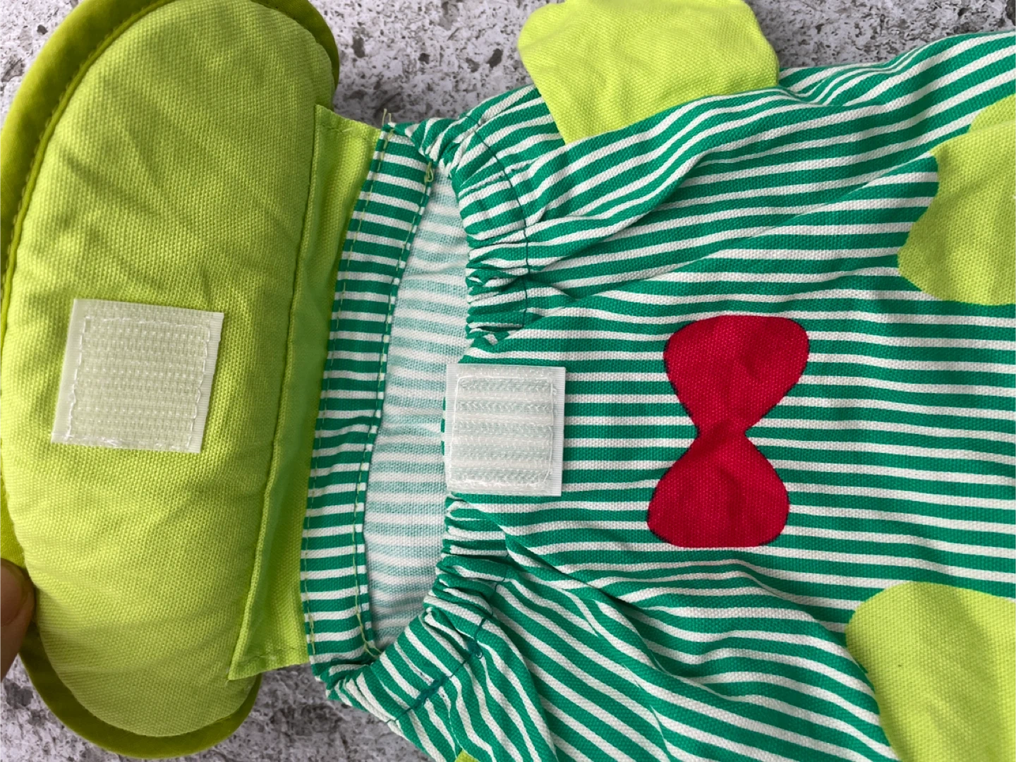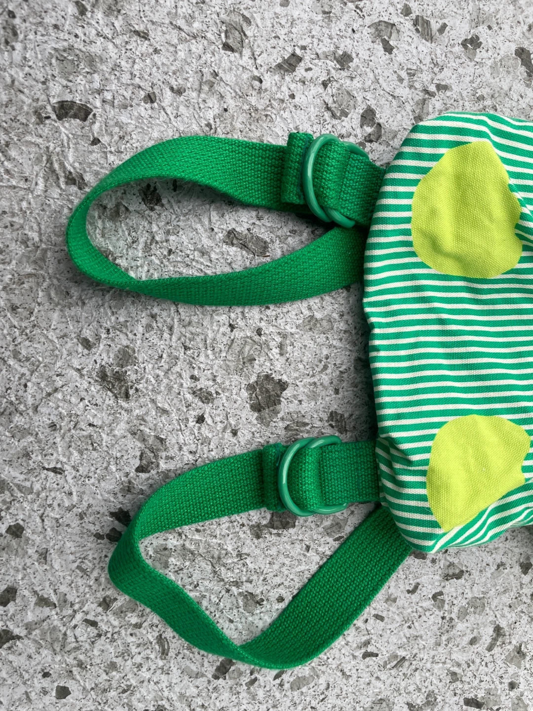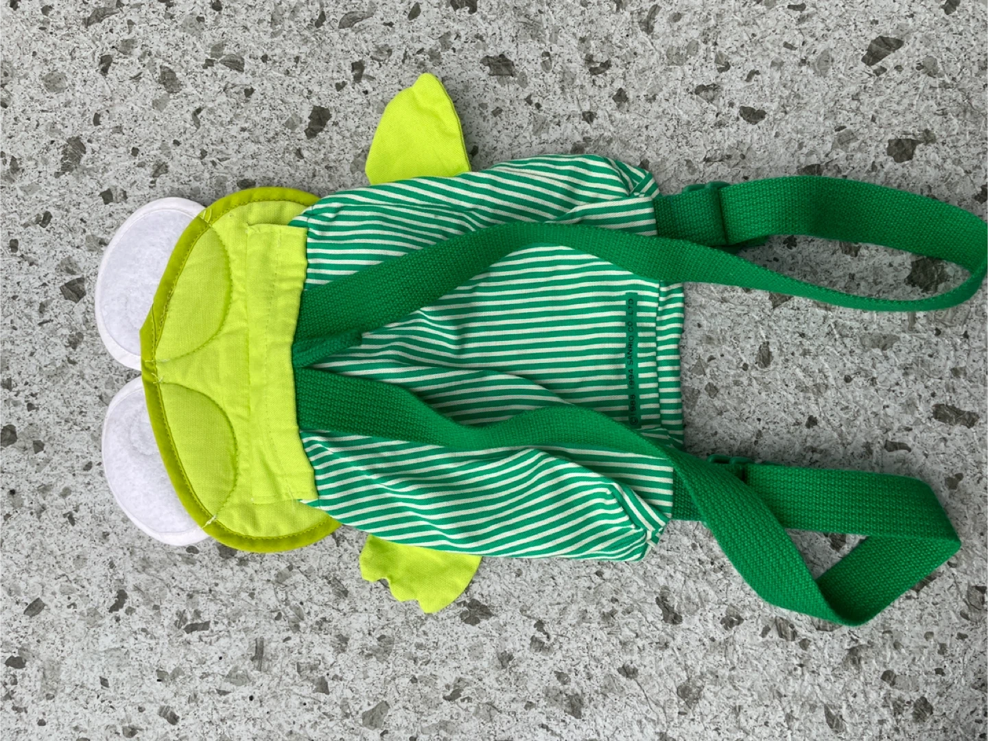 Cute frog backpack with green and white stripes and a red bowtie. It has adjustable green straps and velcro closures. Perfect for carrying small items! 10” near flawless