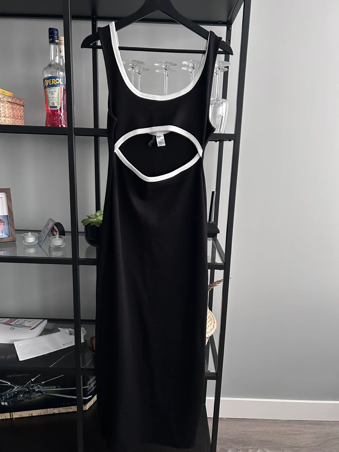 This H&M Divided black maxi dress features a stylish cut-out detail and white trim. It's made from a comfortable knit fabric. Dress size is small. From a pet and smoke free home.