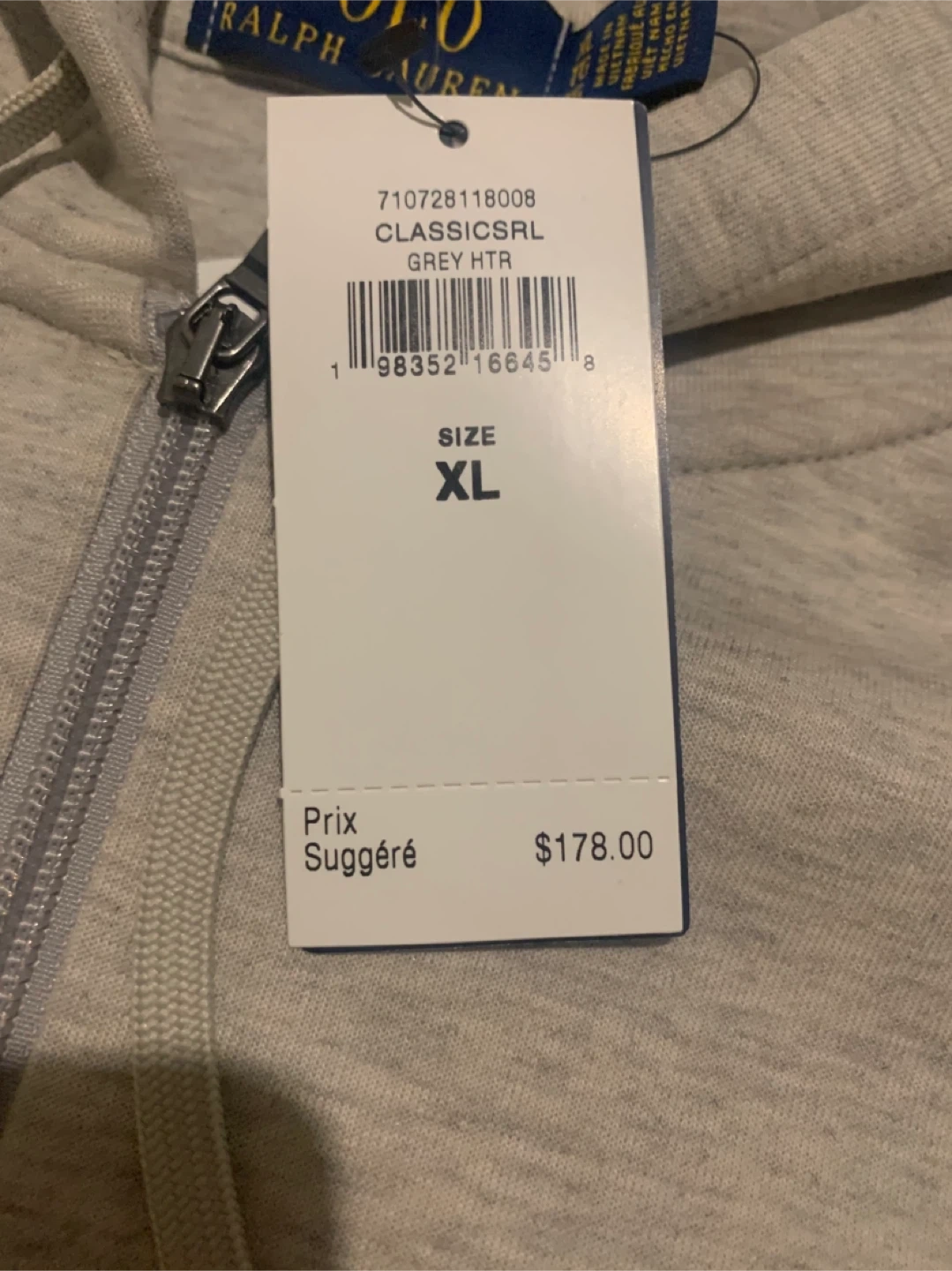 This is a Polo Ralph Lauren full-zip hoodie in size XL but fits like a Large. It's a grey heather colour. Payed 200+ Authentic. Never worn.