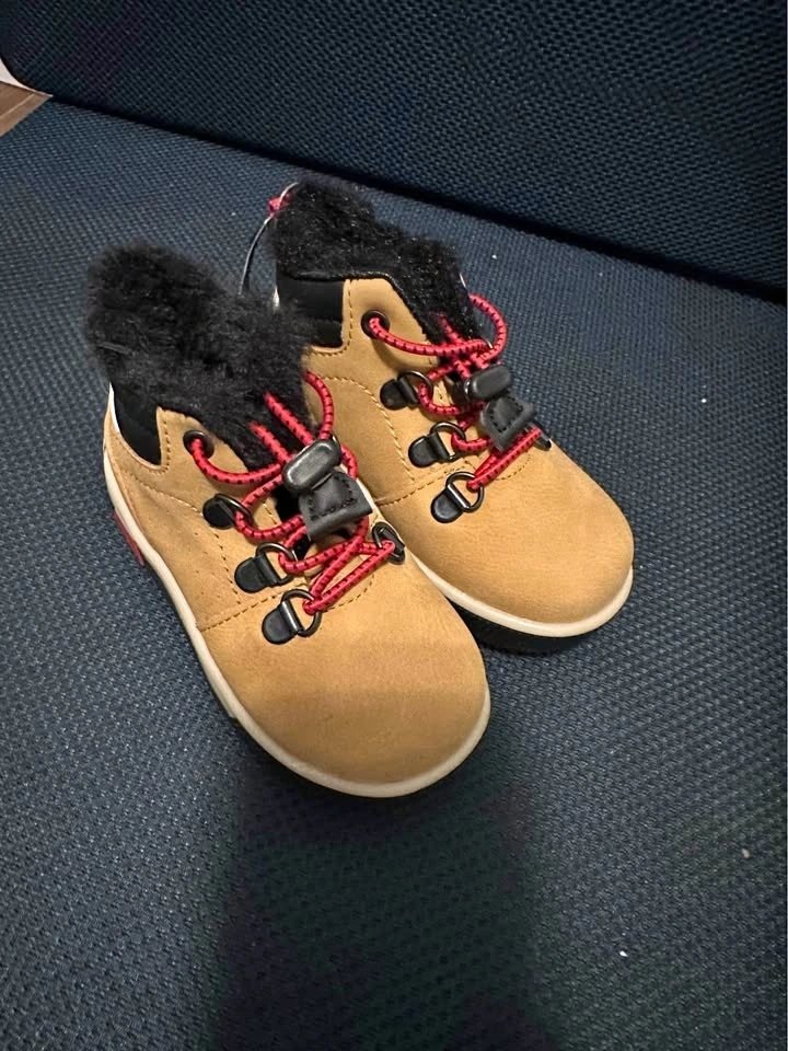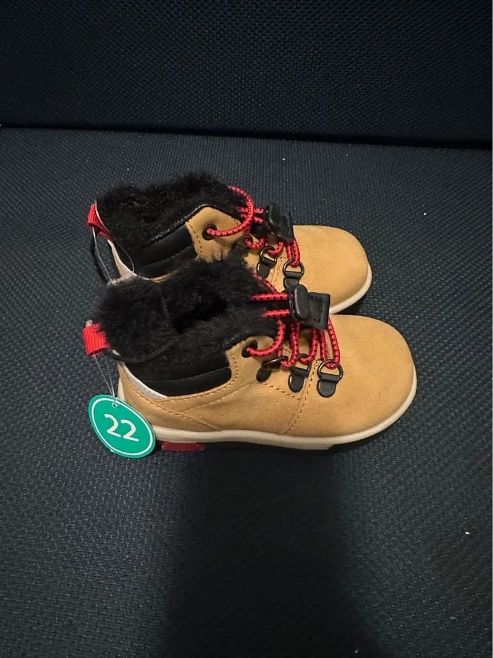 Brand new toddler winter boots, size EU 22 (fits approx. 18–24 months). Warm faux-fur lining and non-slip sole, perfect for winter and fall! Stylish tan color with red lace detail. Never worn, excellent condition. Pickup in Aurora.