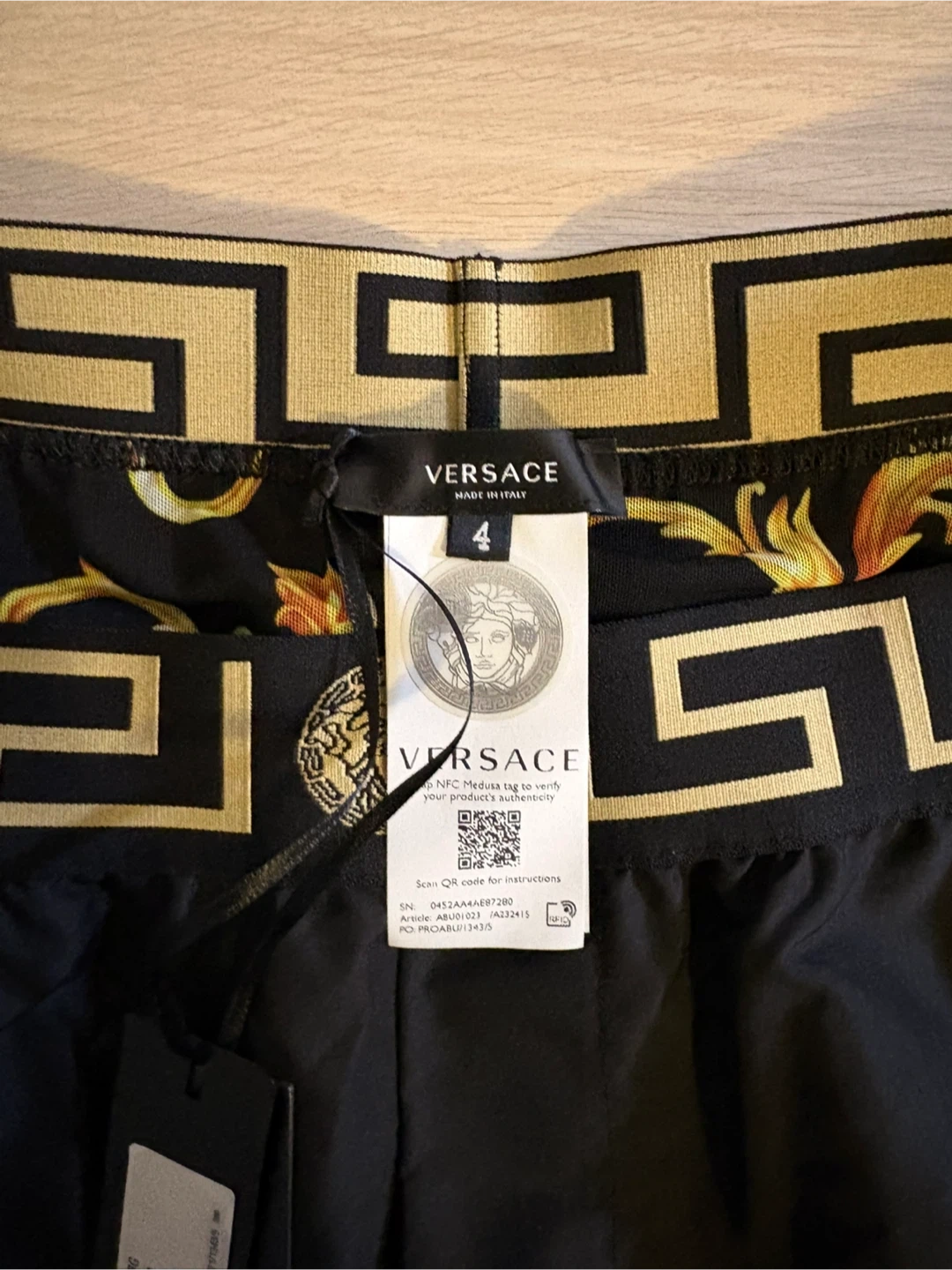 Versace black swim trunks featuring the iconic Greek key and Medusa head motif on the waistband.