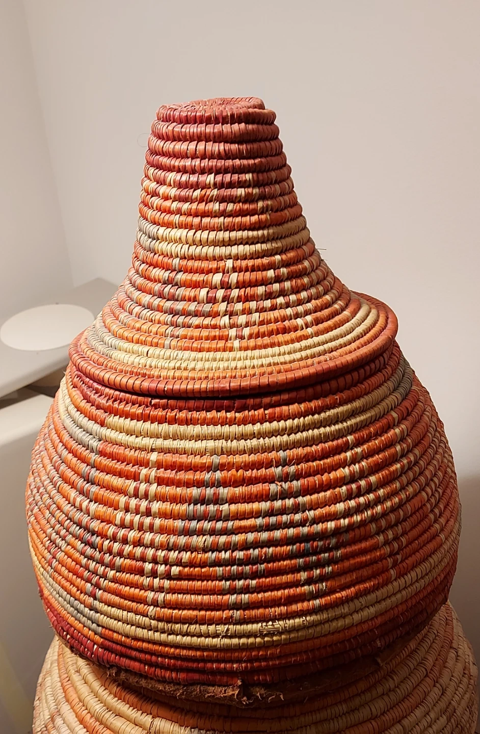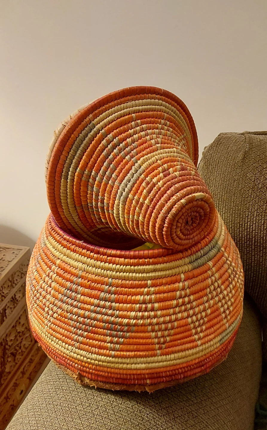 This hand-woven basket features a unique conical lid. It's crafted in the Arabian peninsula from natural fibres with an orange, tan, and green striped pattern, It has a suede-covered bottom. Great for storing items or as a decorative piece in your home!
