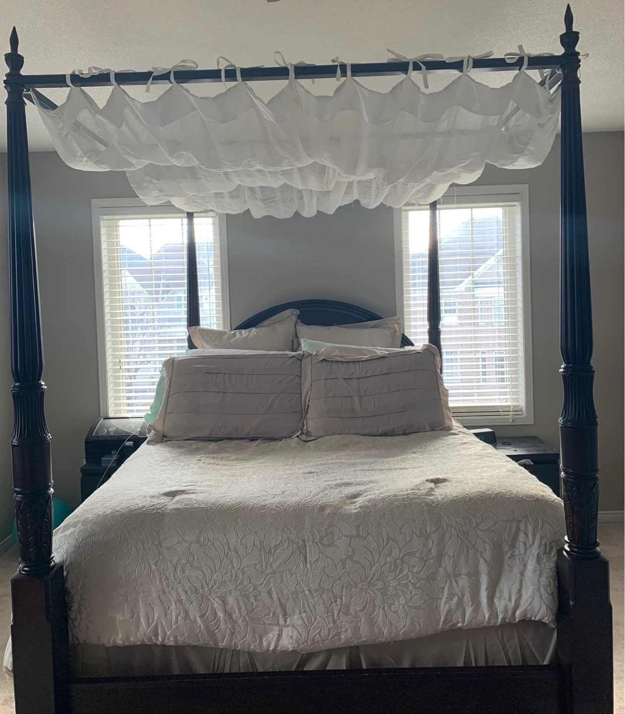 This is a gorgeous, stately mahogany four poster bed with a removable canopy made by the Bombay Company. There are beautiful carvings on the posts. The canopy support can be removed so it can be used just as a four poster bed.