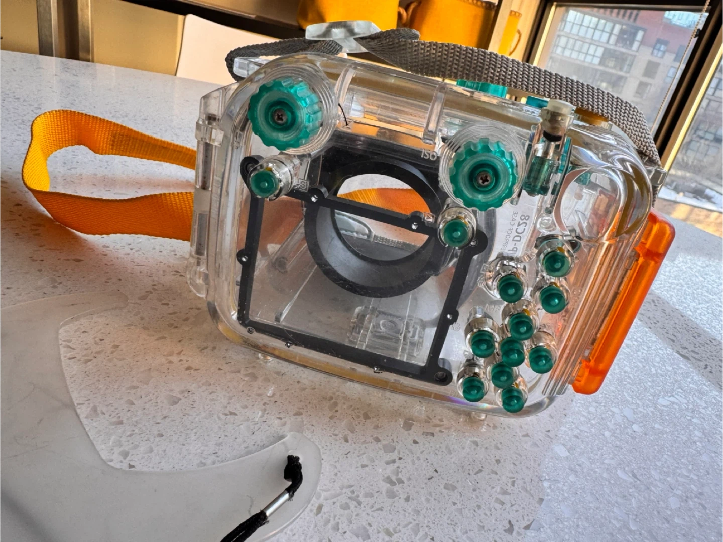 This is a Canon WP-DC58 underwater camera housing. It's made of clear polycarbonate plastic with green and orange accents. It comes with a neck strap and is designed for specific Canon camera models.