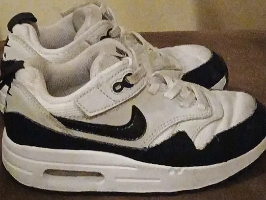 These Nike Air Max 1 shoes are white with black accents. They're designed for kids. Features a hook-and-loop strap closure over the laces for a secure fit. Great for everyday wear!
