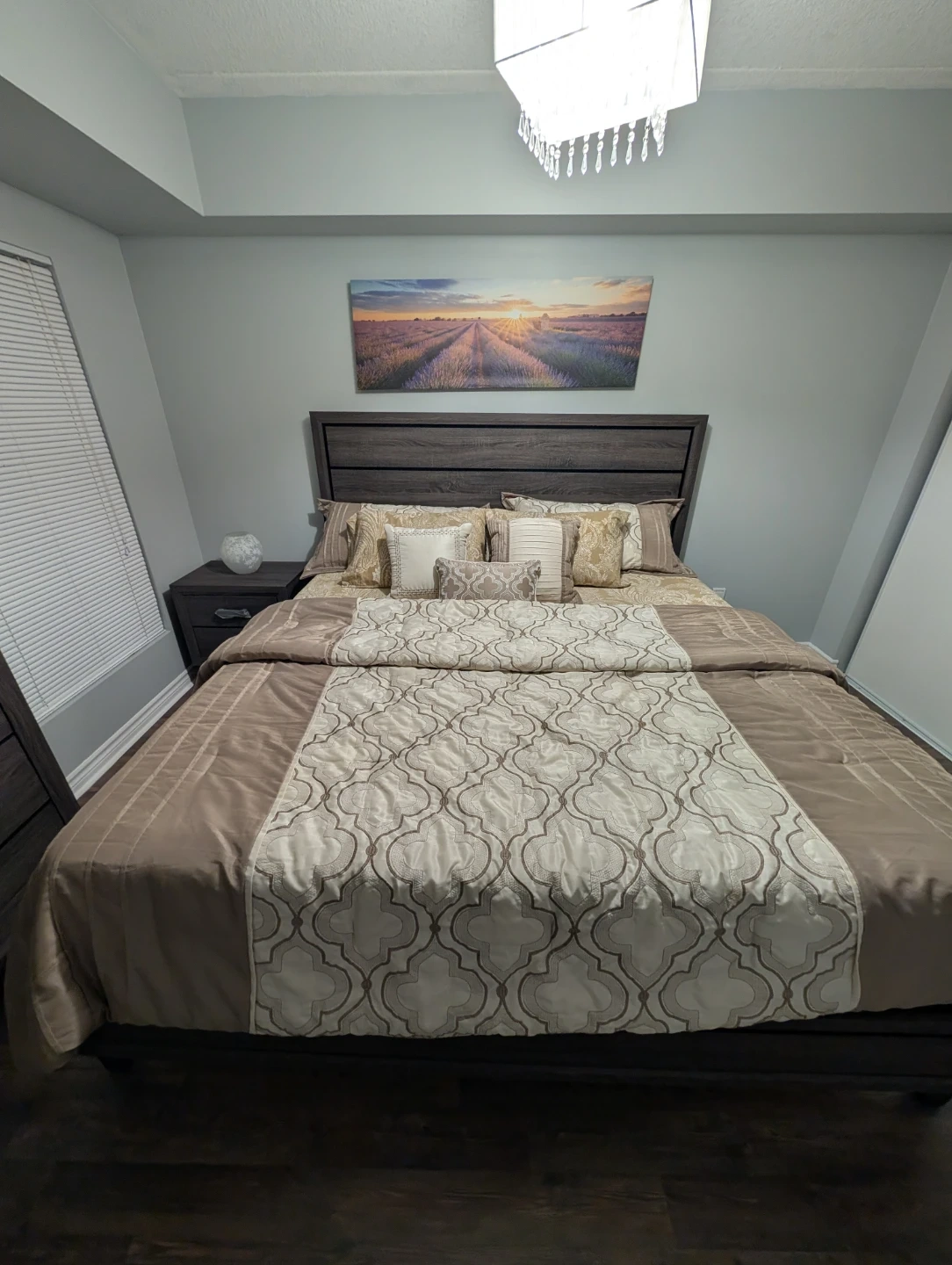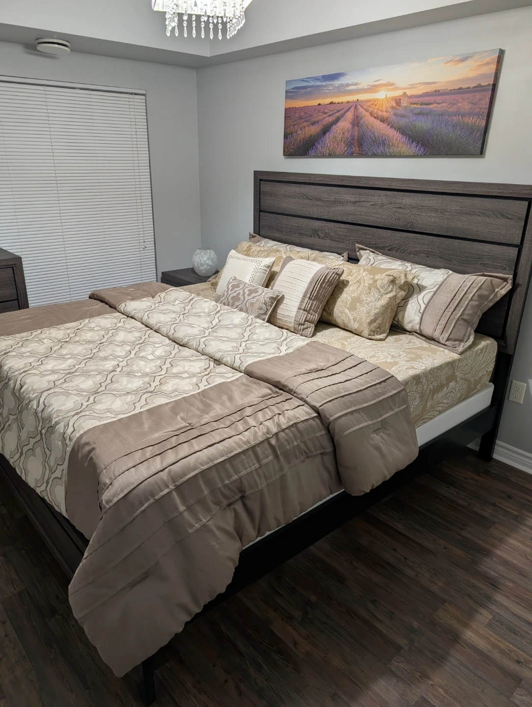 This 4-piece bedroom set transforms your bedroom with a modern style. It's made of solid birch and engineered wood with sleek metal accents. This set includes a king size bed frame with a headboard, nightstand, dresser, and mirror, all in a grey wood colour with natural grain variation for a rustic touch. Clean-lined edges and tapered bracket feet tie the room together, while the horizontal drawer pulls in a chrome finish to add accented detail. To complete this set, I am also selling box springs and an unused king size Endy mattress separately.