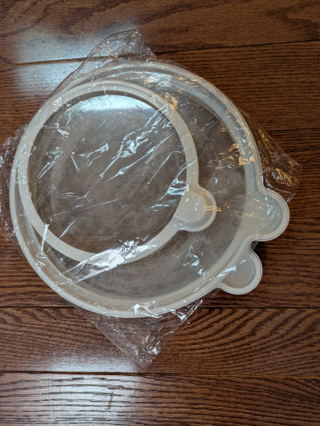 This is a round white plastic lid for a cake carrier. It's in new condition, still sealed in its original plastic packaging. It's designed to keep your baked goods fresh and protected during transport.