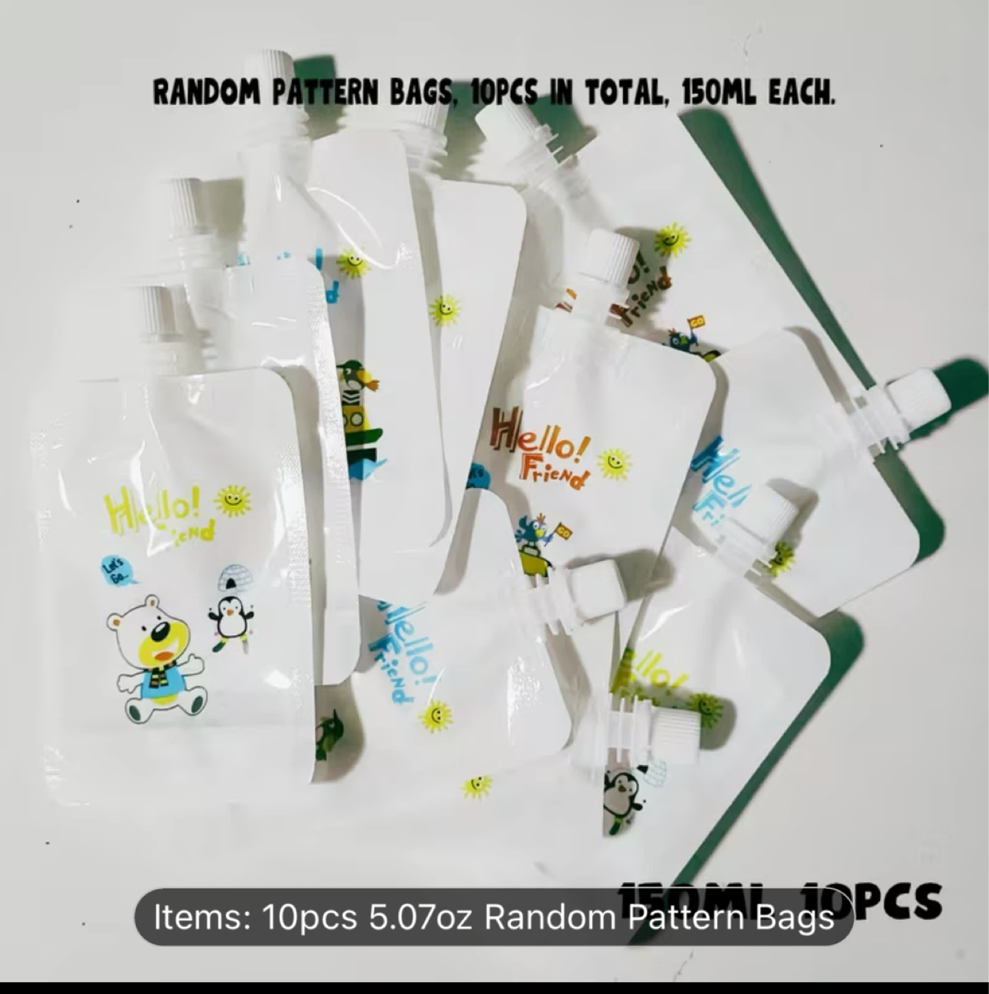 This set includes 10 reusable squeeze pouches for food. They feature a fun random design and are perfect for on-the-go snacks. BPA-free material.