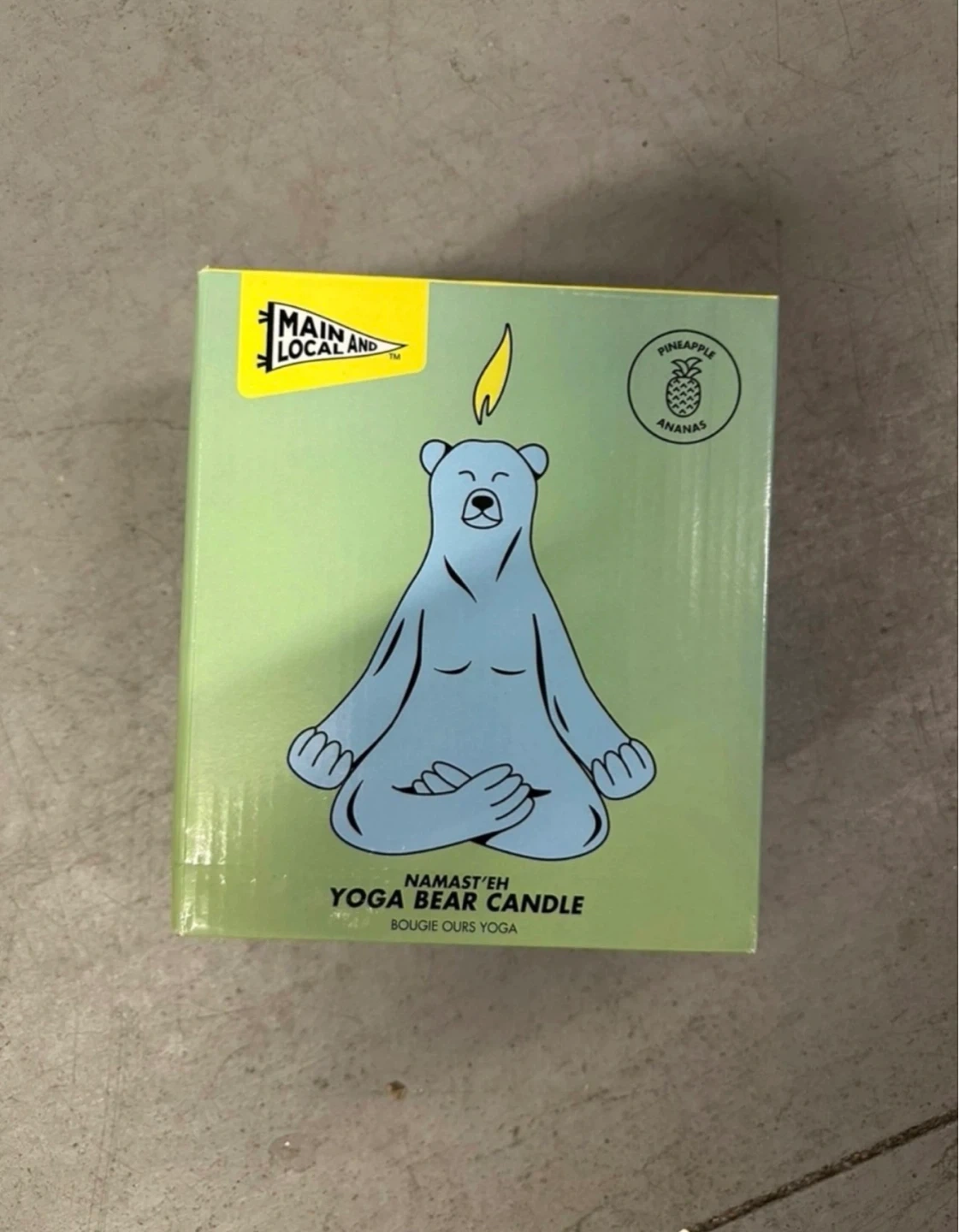 Main & Local Namast'eh Yoga Bear Candle in a pineapple scent. This candle's designed like a bear in a yoga pose. It's a unique addition to your space!