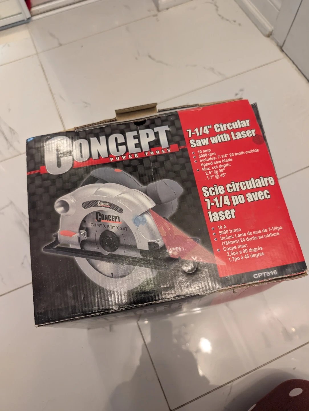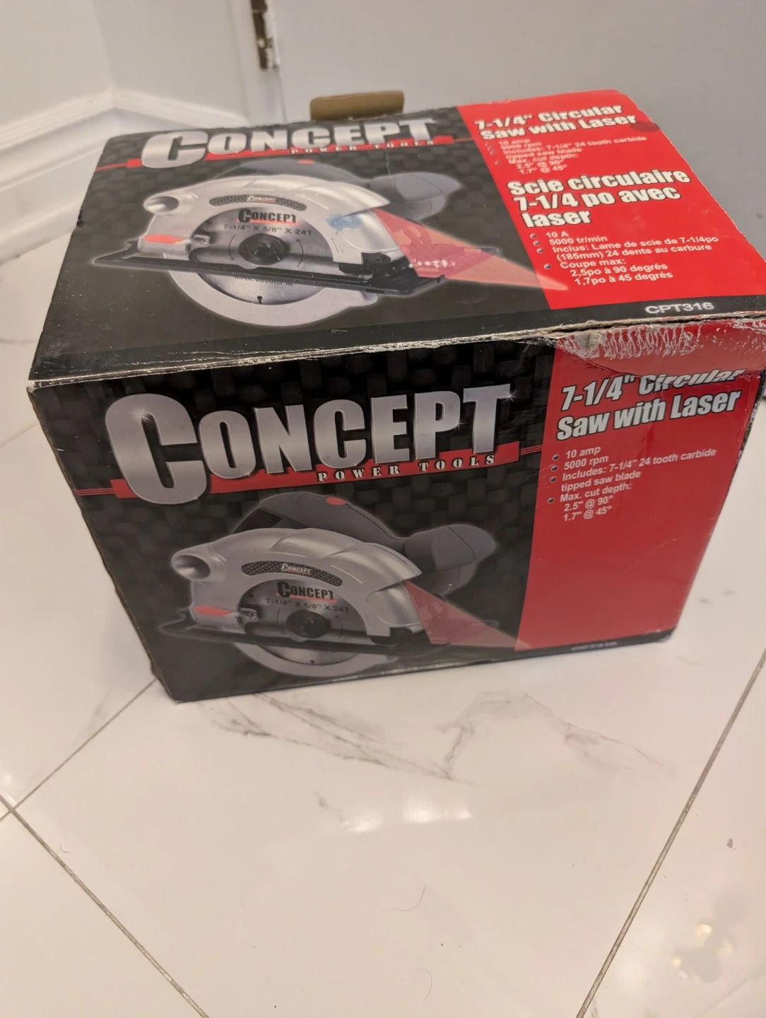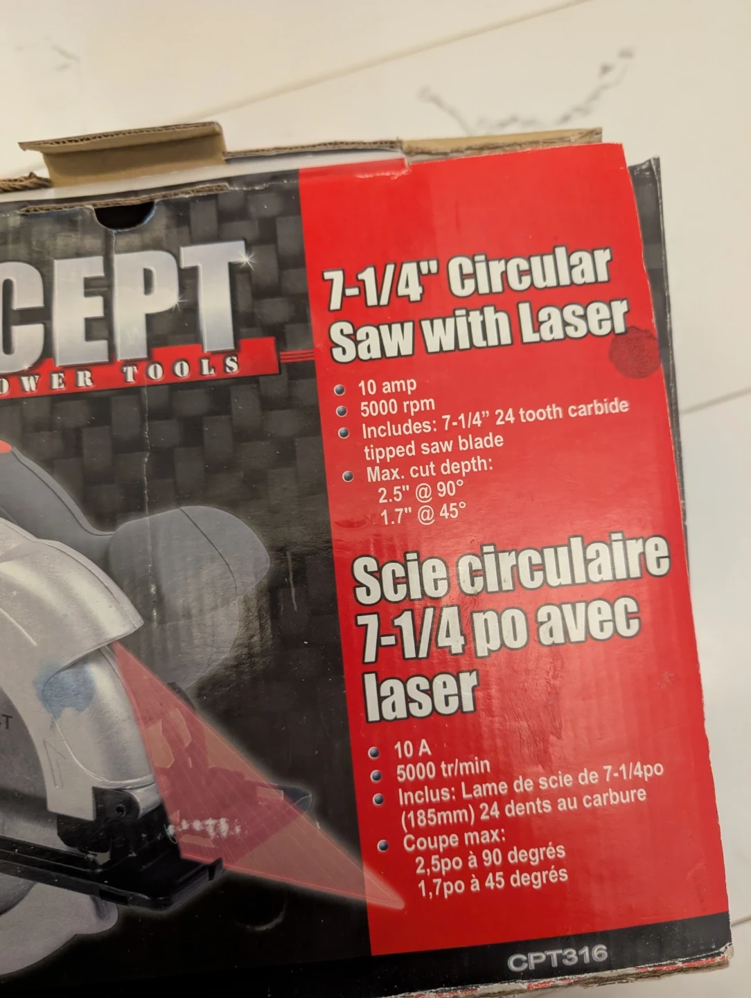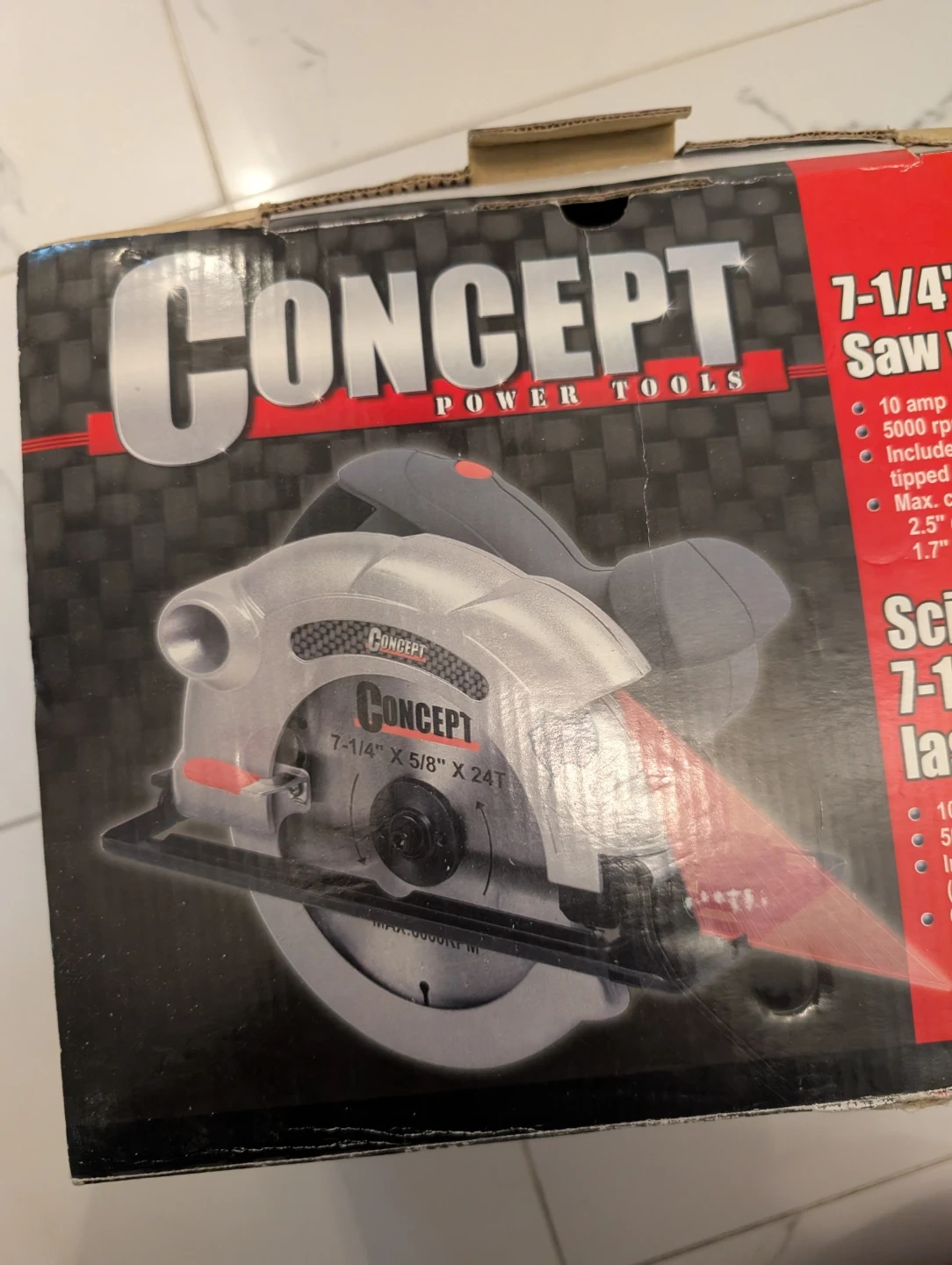 This Concept power tool is a 7-1/4 inch circular saw. It comes with a laser guide for precision cuts. Includes a 24-tooth carbide blade. Max cut depth is 2.5" at 90 degrees and 1.7" at 45 degrees.