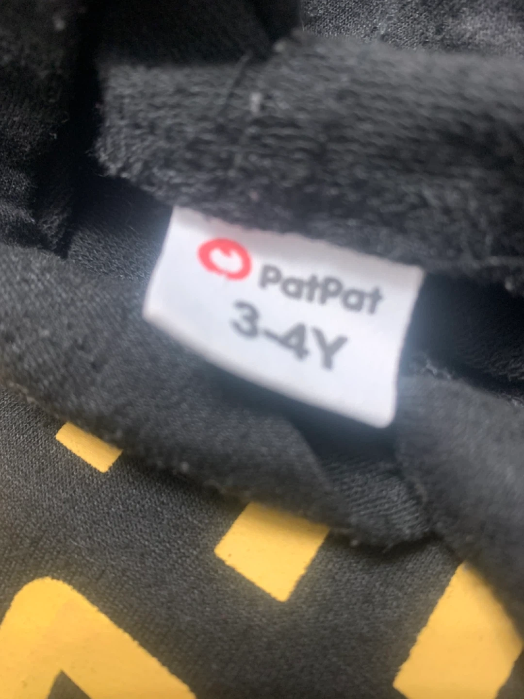 This is a black PatPat hoodie dress for kids. It's sized 3-4 years and features a yellow "Mini Boss" graphic. The dress is made of a soft fabric blend.