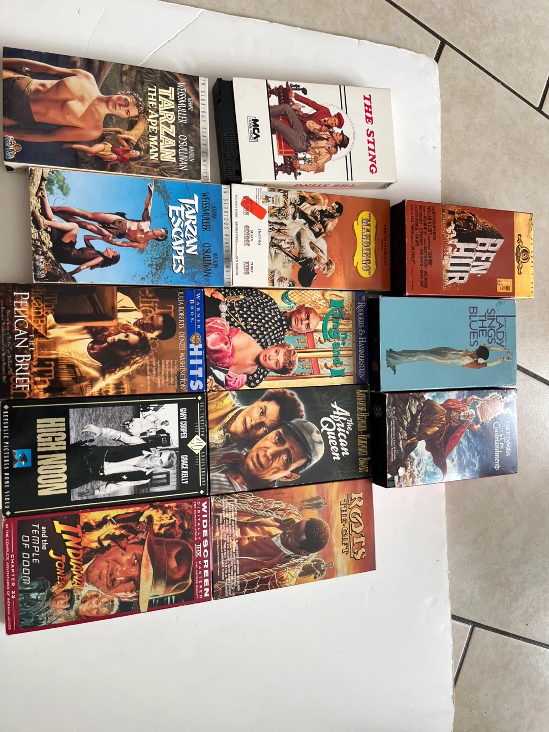 Collection of 10 VHS tapes including classic films. Titles range from 'Tarzan the Ape Man' to 'Indiana Jones and the Temple of Doom'. These tapes are perfect for a retro movie night.