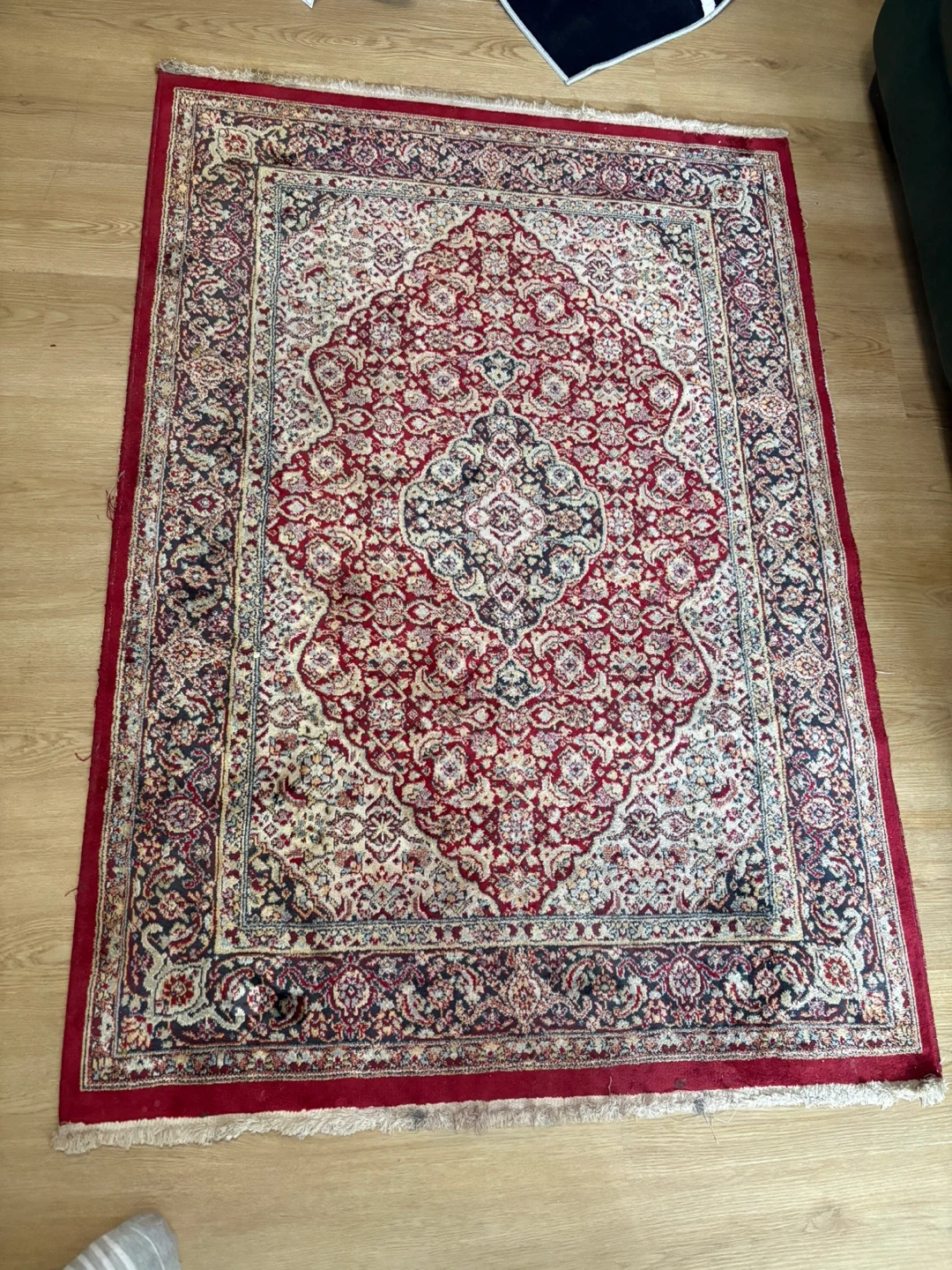 This is a Persian-style area rug with a traditional red, cream, and navy blue pattern. It's fringed on two ends and features an intricate floral design throughout. The colours are rich and vibrant. Movie sale.