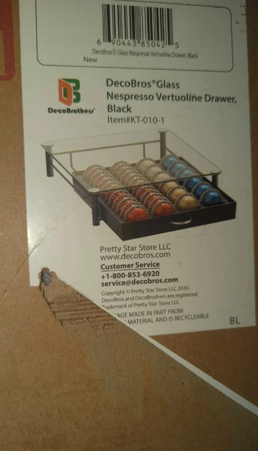This is a DecoBros Glass Nespresso Vertuoline Drawer in black. It holds Nespresso Vertuoline pods. The drawer is made of glass and metal, with a pull tab for easy access. Only opened to ensure safety