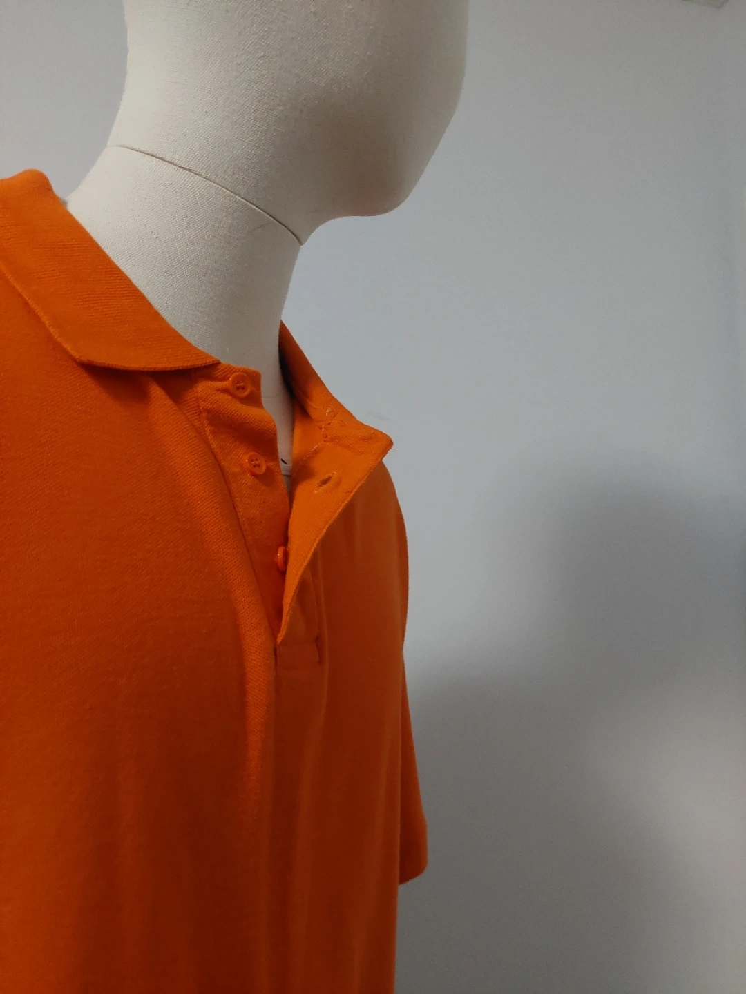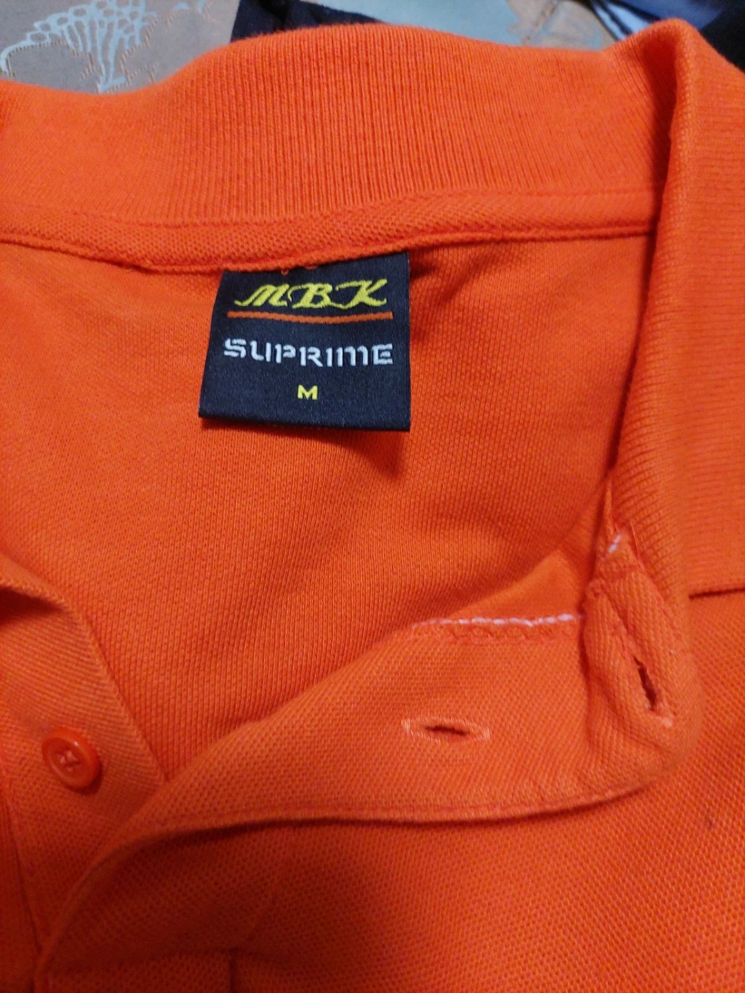 This is an orange short-sleeve polo shirt from MBK SUPRIME. It's a size medium. The material is cotton blend.