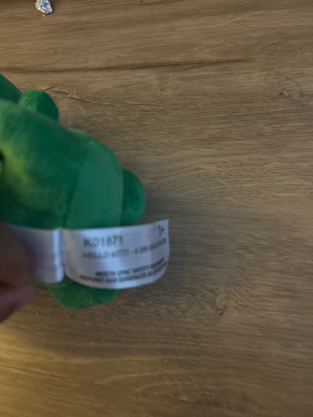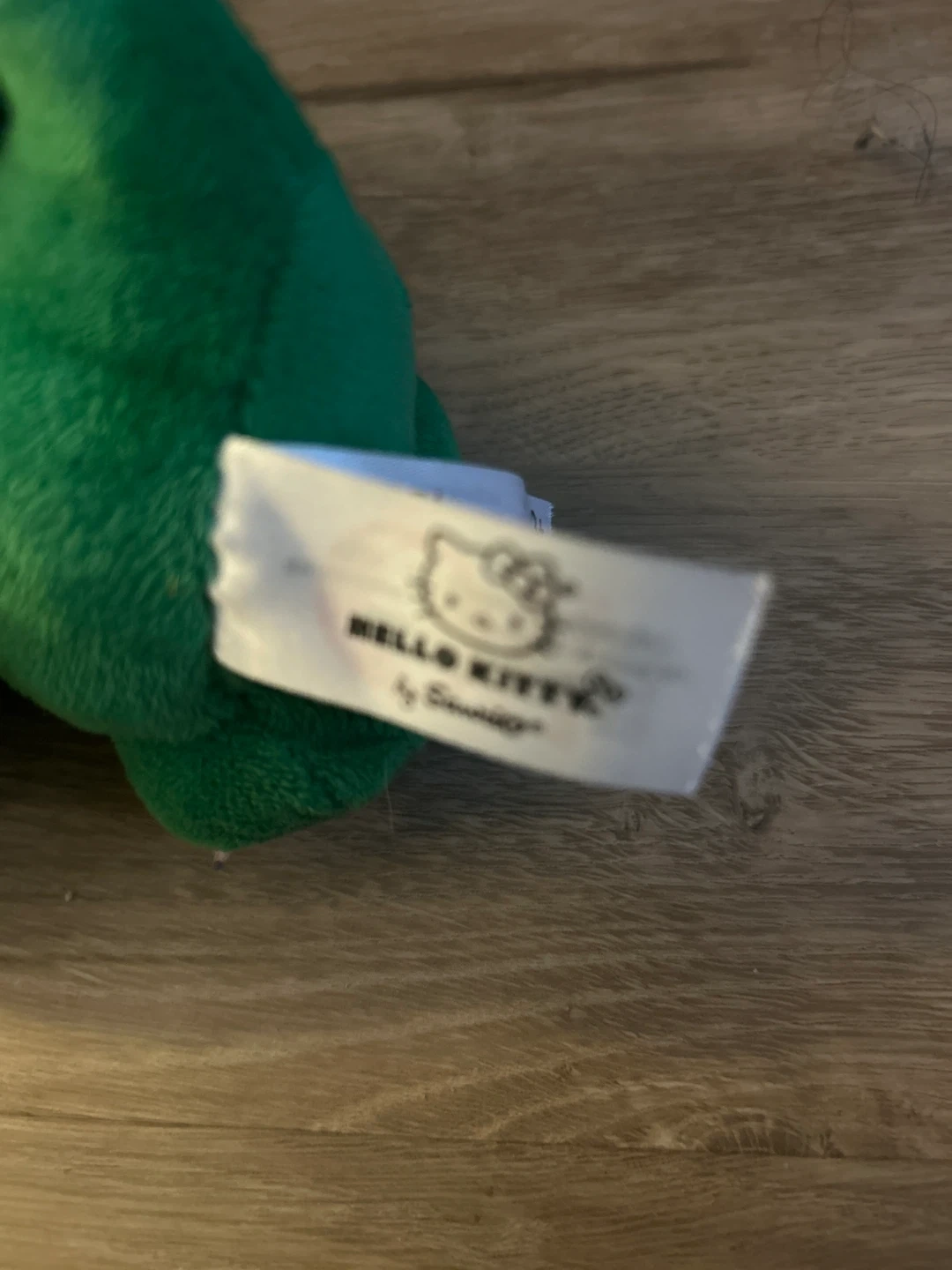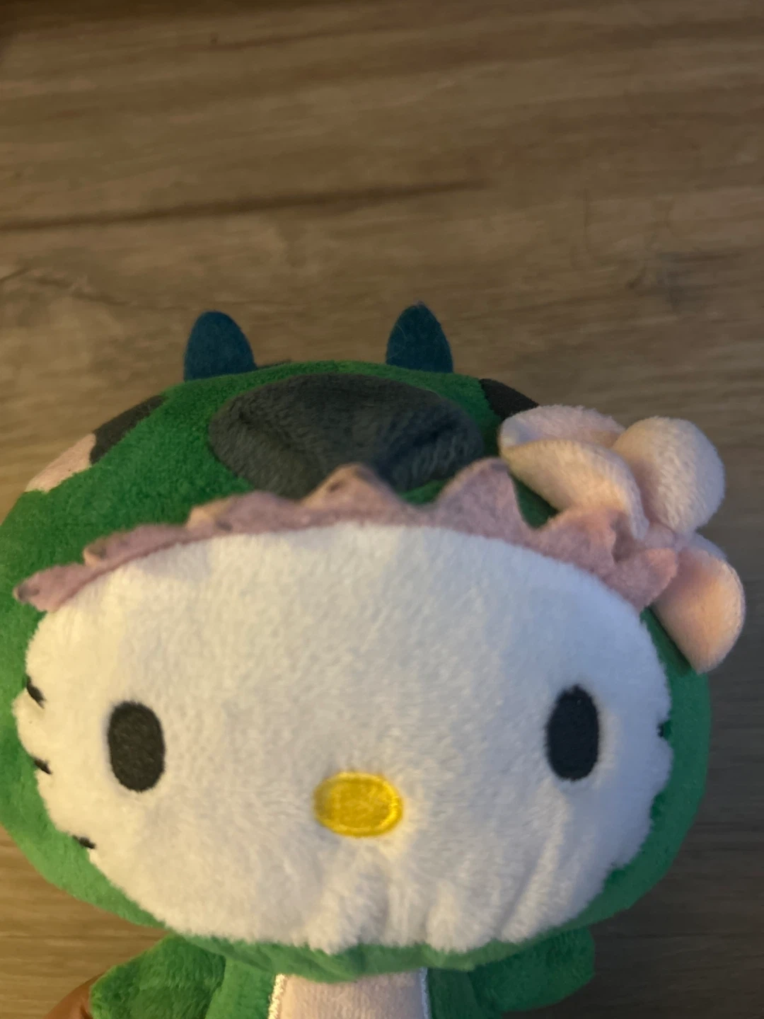This is a cute Hello Kitty plush toy dressed as a dinosaur. It's green with pink accents and a soft, cuddly texture. Perfect for Hello Kitty fans and collectors!