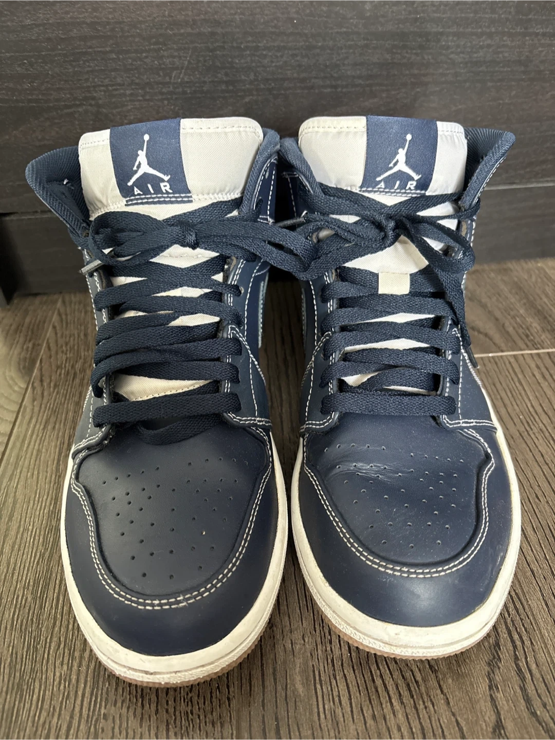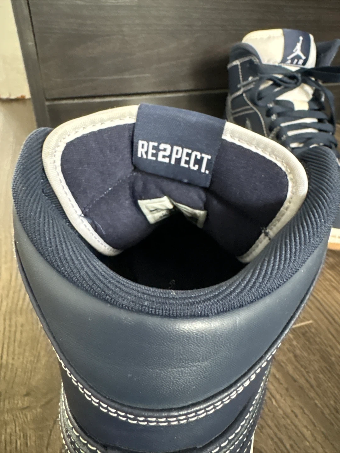 These Air Jordan 1 Mid Top sneakers come in a navy blue colour with white accents. They feature the "RE2PECT" detail on the tongue. The shoes are made with leather uppers. This is a great pair for sneaker enthusiasts!