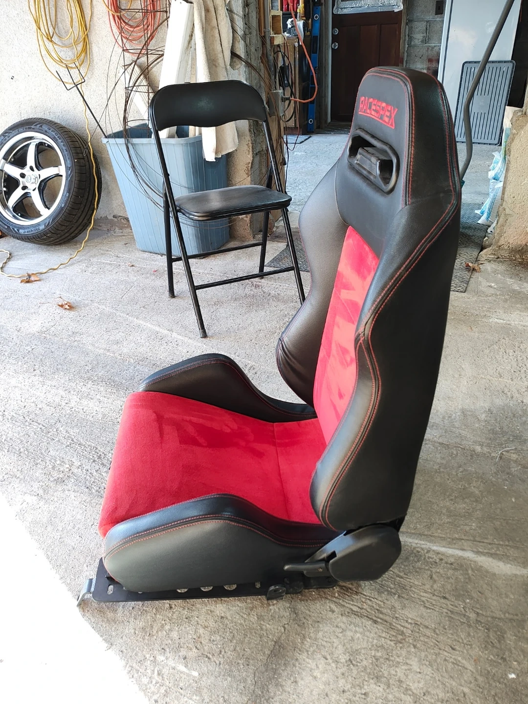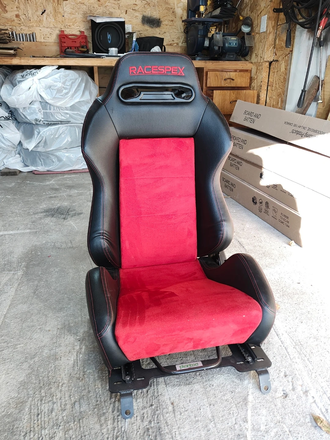 This is a Racespex racing seat with black leatherette and red fabric inserts. It's designed for performance and comfort. Mounting hardware is included.