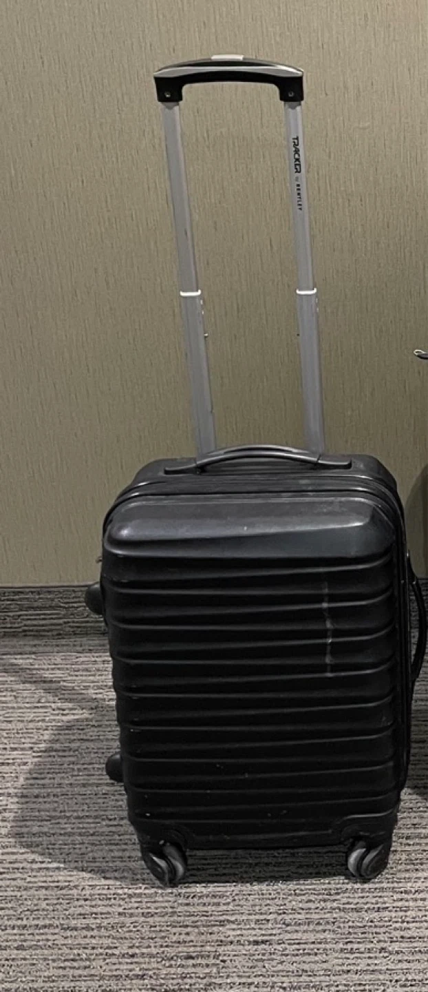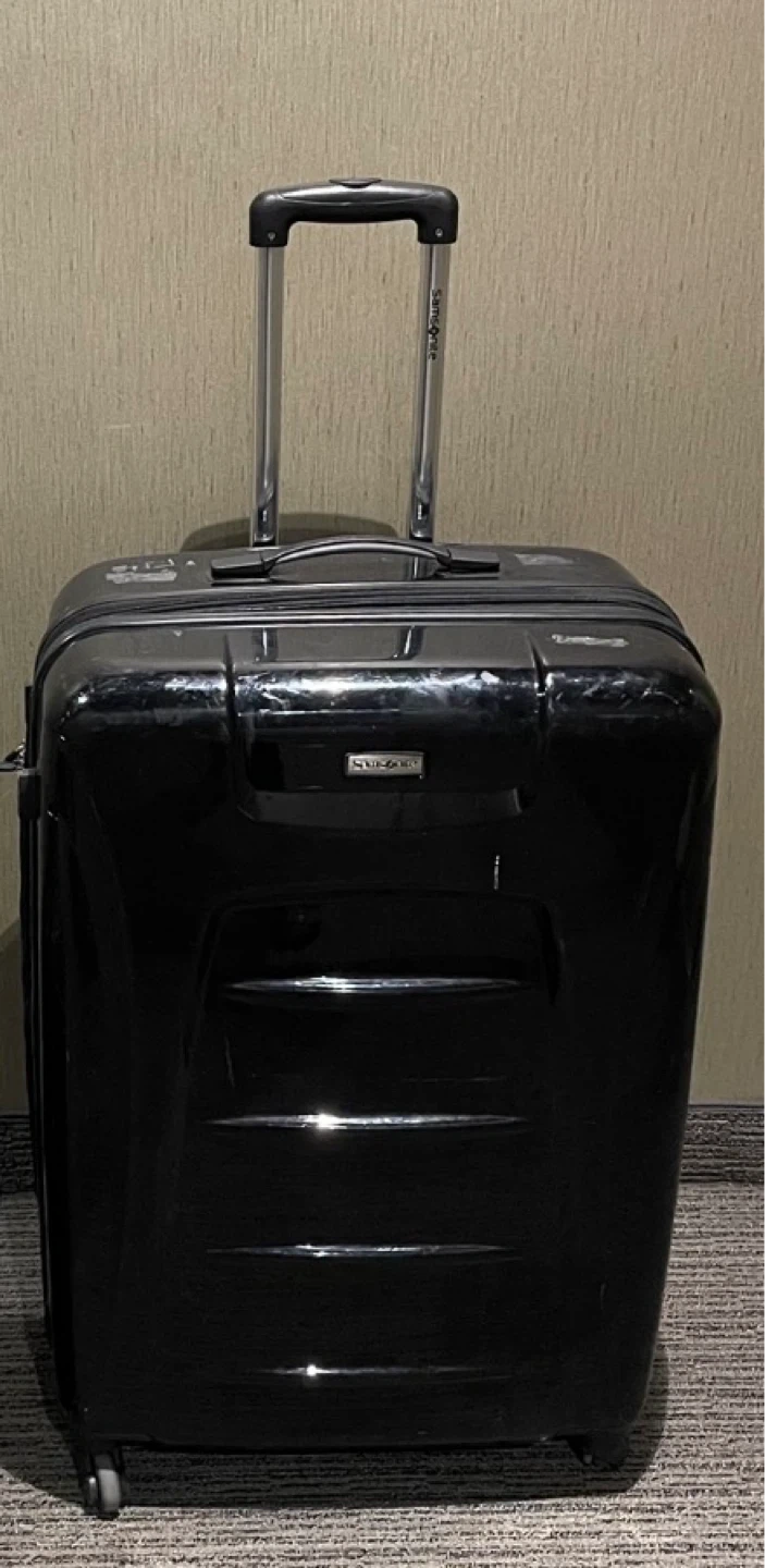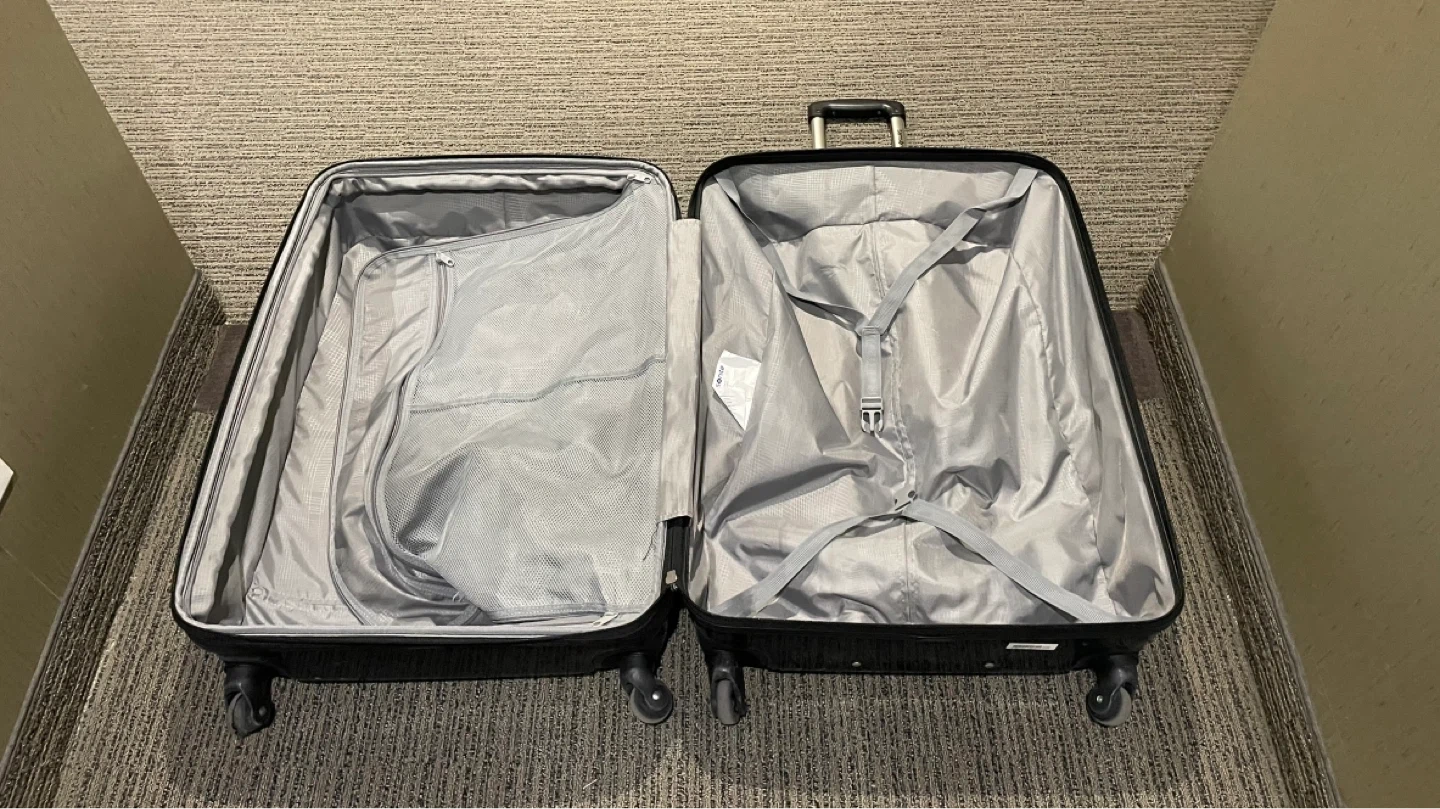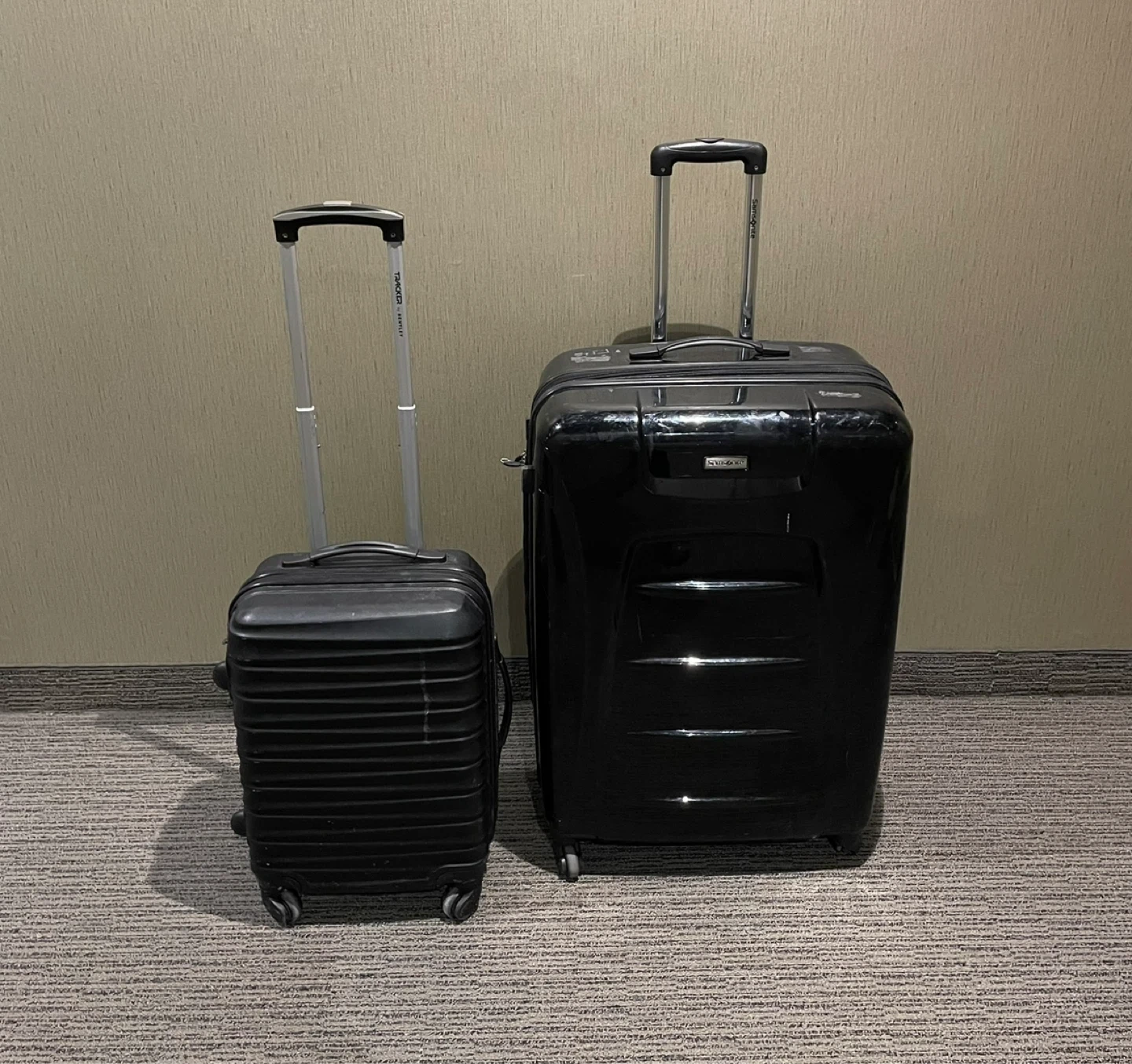 This set includes a carry-on and a larger checked suitcase. Both have spinner wheels and extendable handles. Interior features include straps and a zippered mesh compartment. The hard shell exterior is black.
