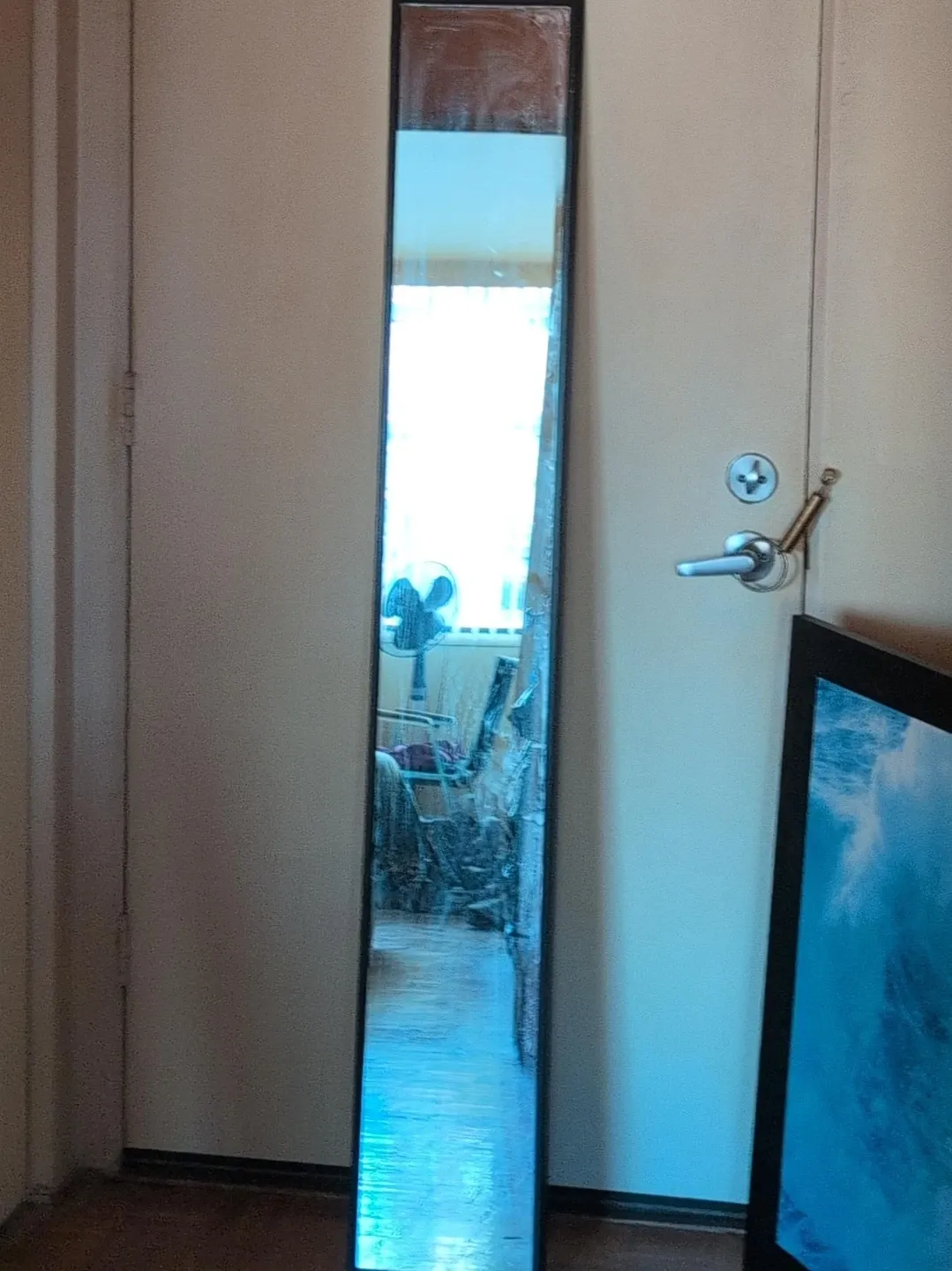 A tall, rectangular wall mirror with a dark frame. It's perfect for checking your outfit from head to toe. Measures approximately 5 feet tall. The frame has a simple, modern design.