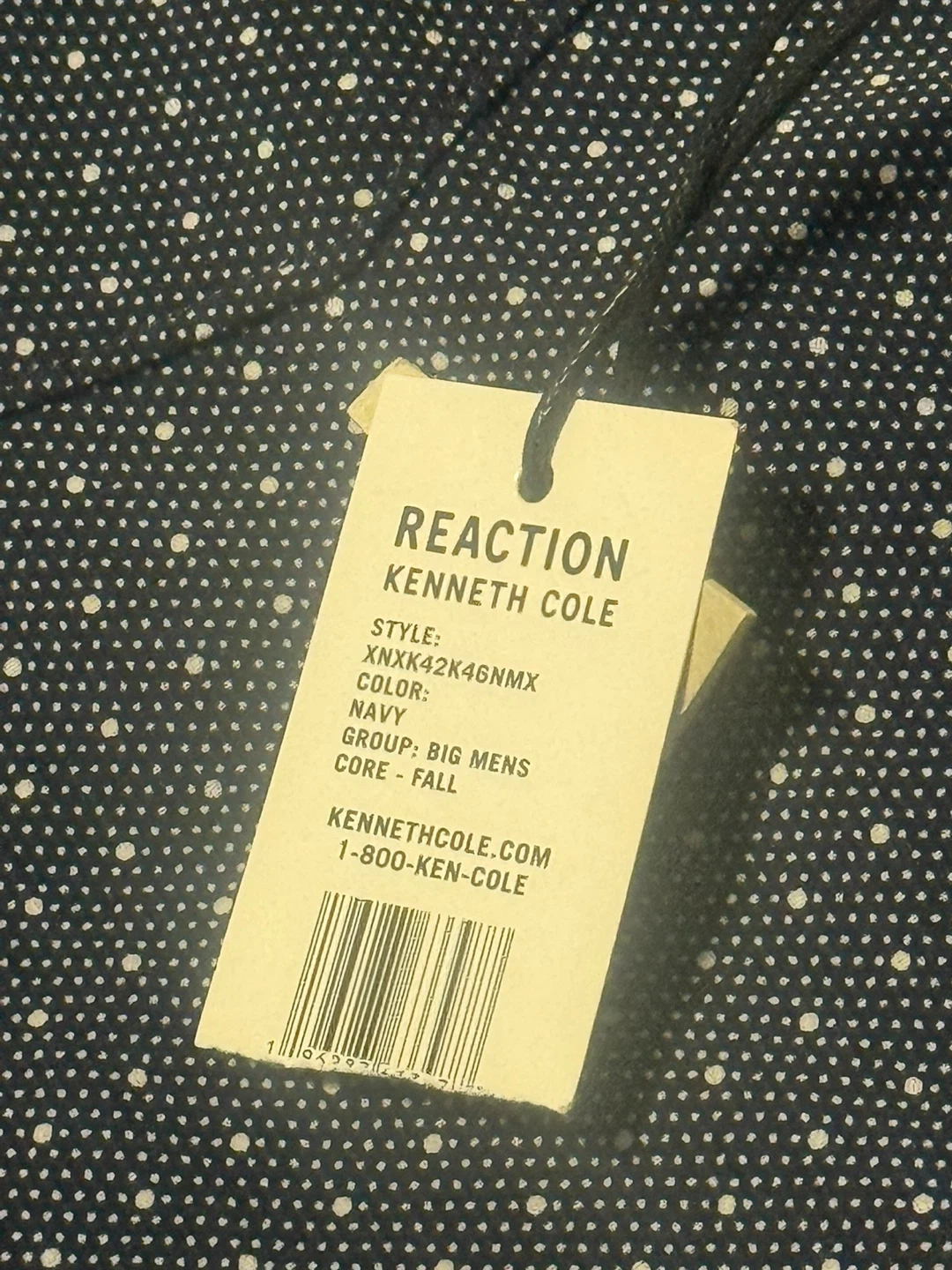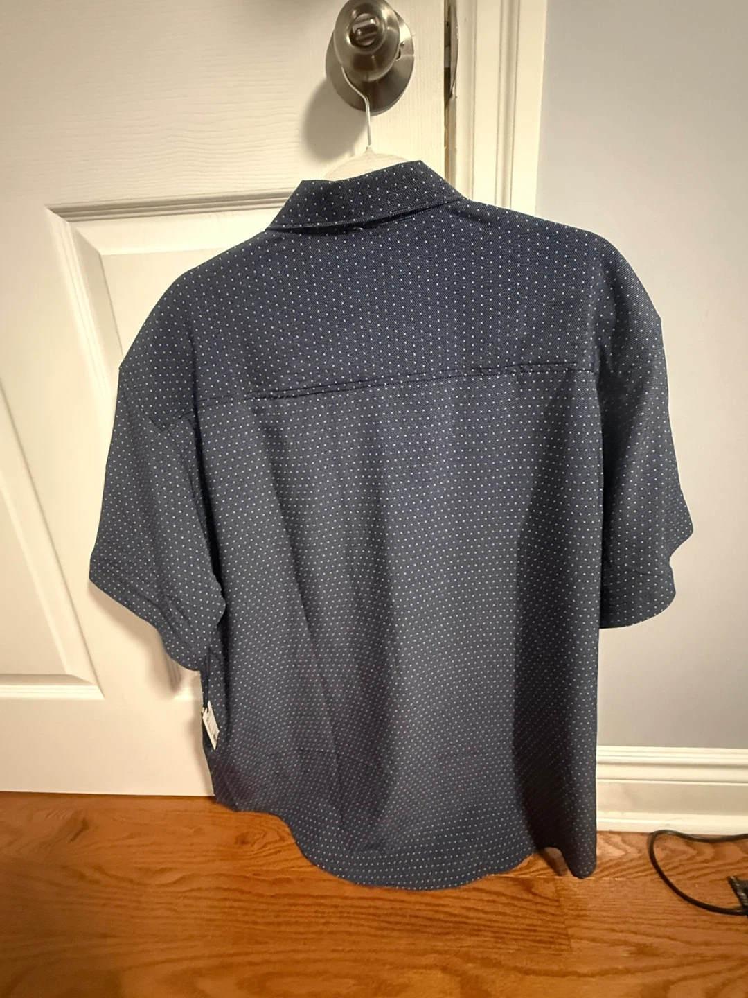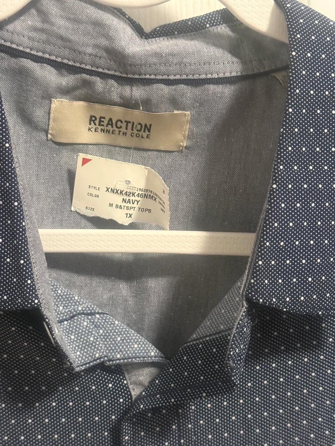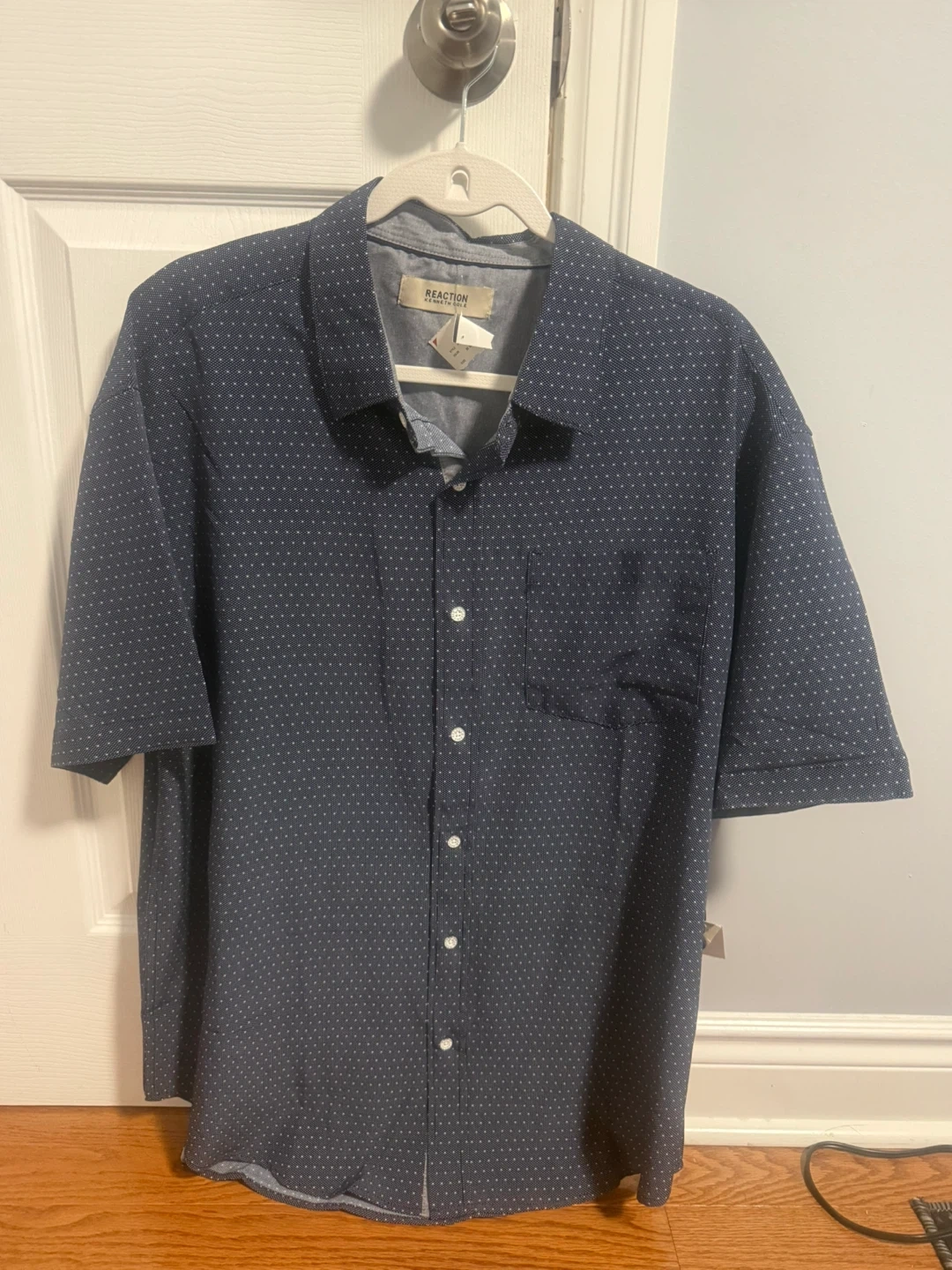 Reaction Kenneth Cole button-up shirt in navy with a white polka dot pattern. It's a short-sleeved collared shirt with a chest pocket. This shirt is size 1X. Perfect for casual wear!