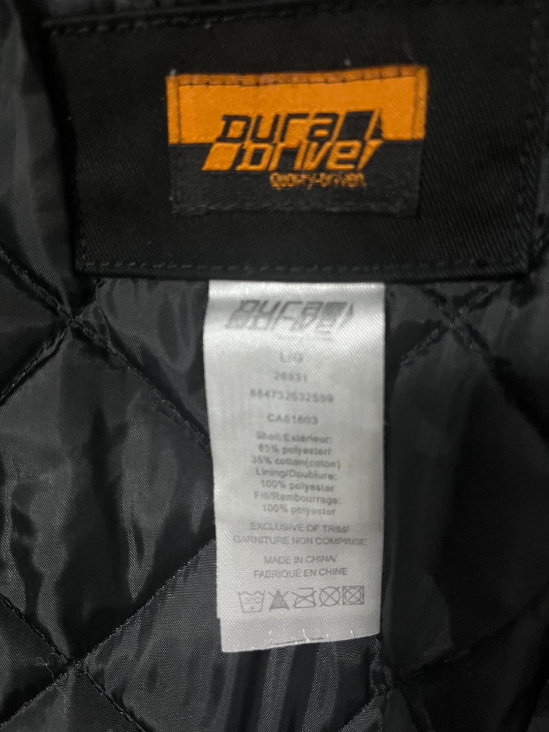 DuraDrive jacket with a quilted lining. Shell is 65% polyester and 35% cotton. Lining is 100% polyester. Fill is 100% polyester.