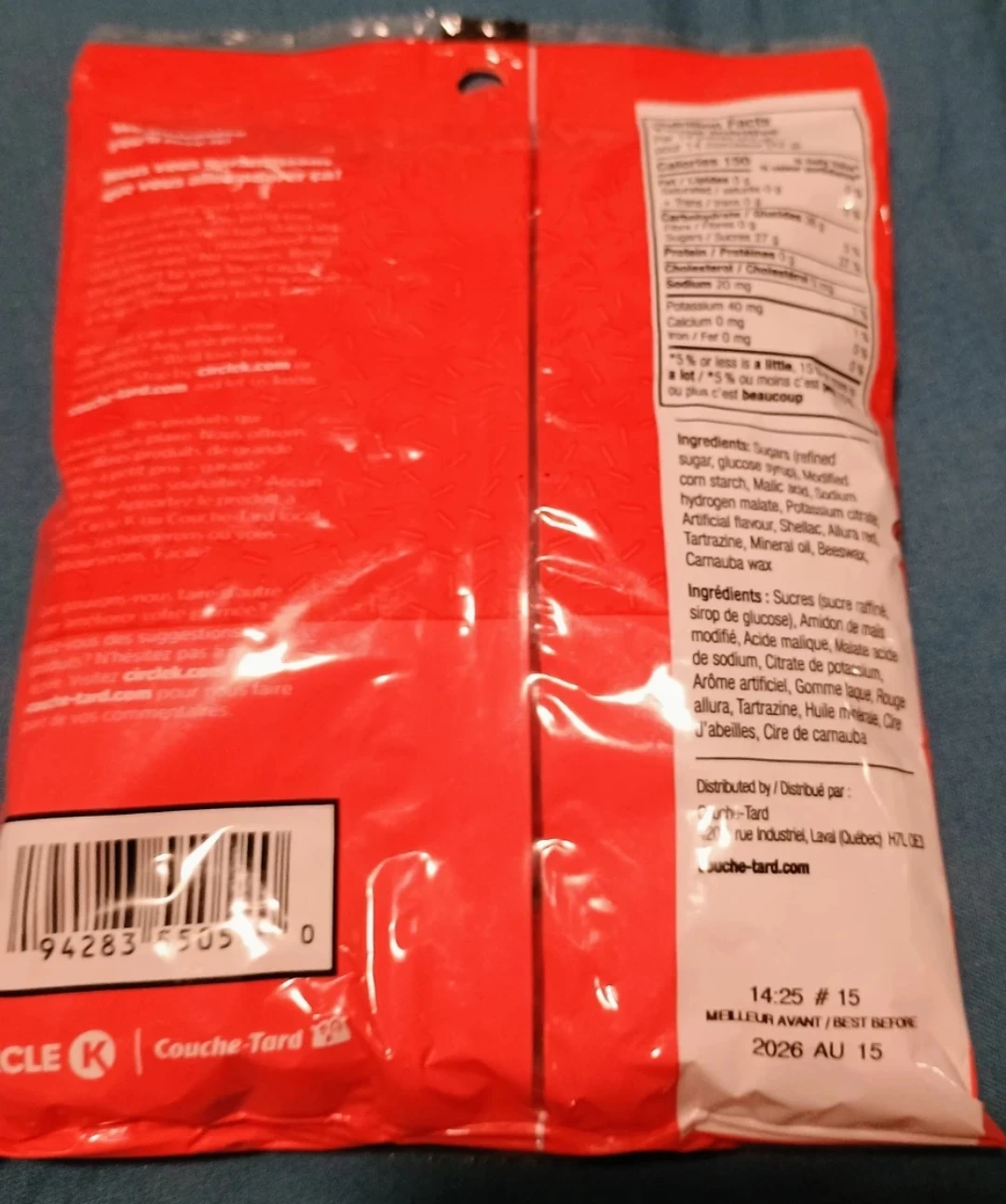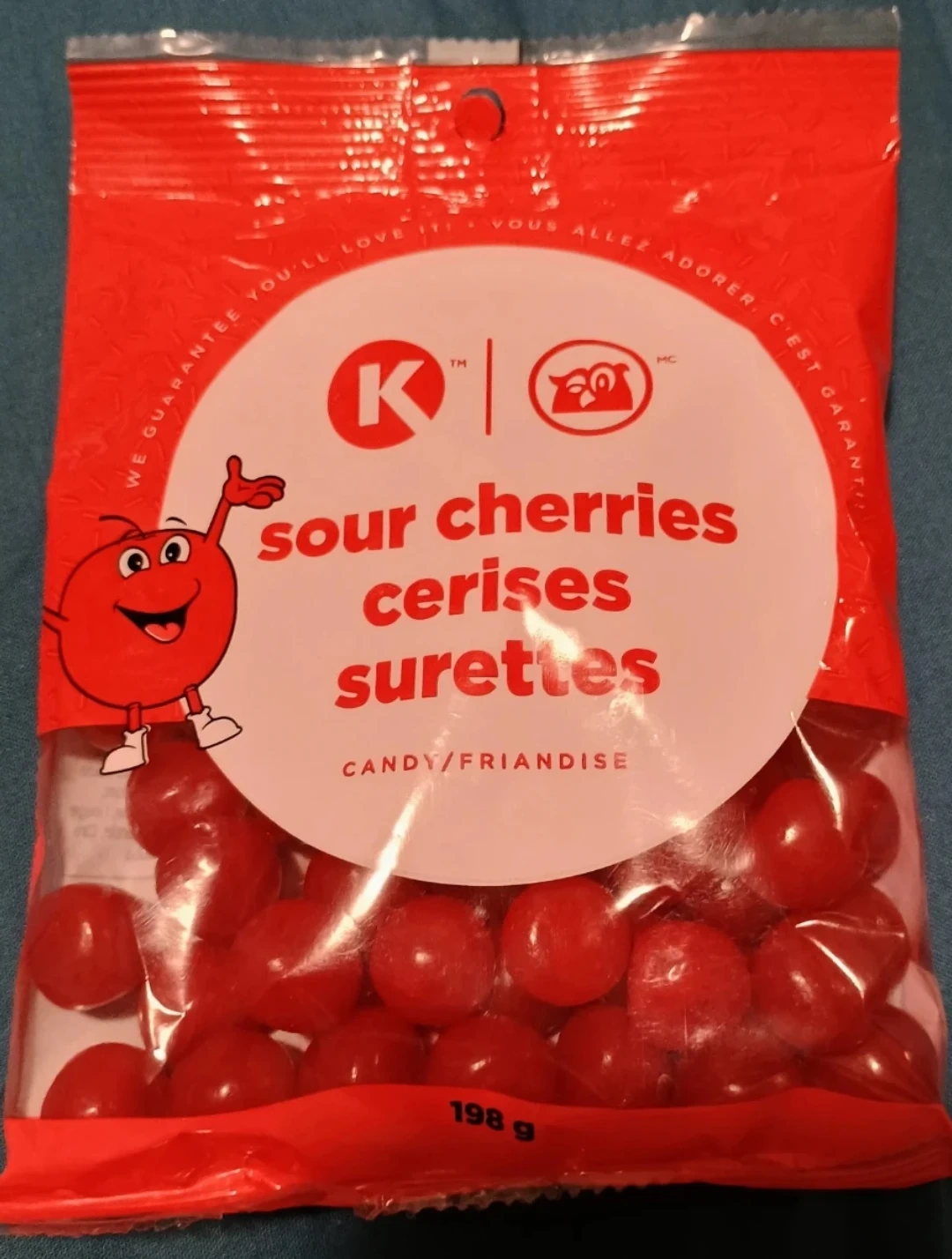 Circle K's delish sour cherries candy comes in a 198g bag.