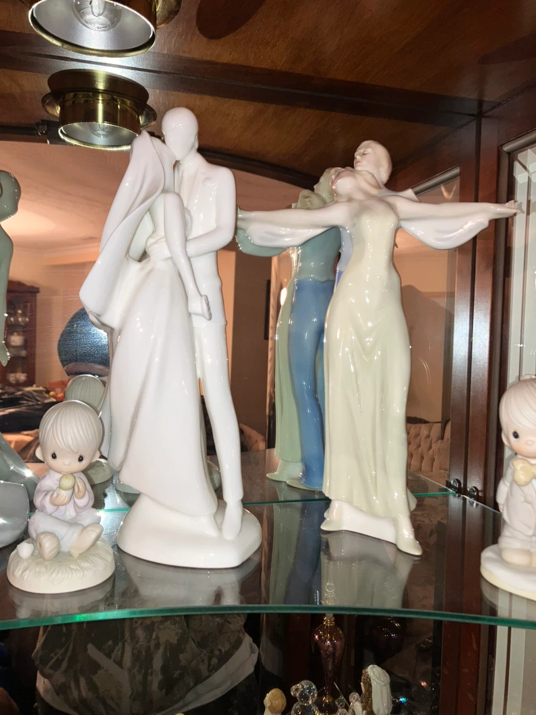 A collection of Precious Moments figurines featuring wedding couples, angels, and children. These decorative ceramic pieces add a charming touch to any display.