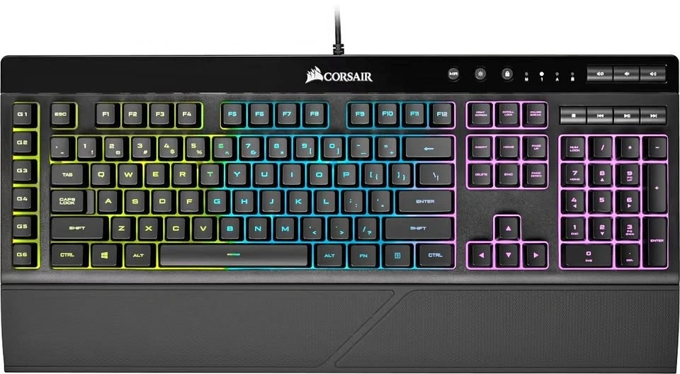 Dynamic three-zone RGB backlighting, six dedicated macro keys, Elgato Stream Deck software integration, IP42 dust and spill resistance, detachable palm rest included, Corsair iCue compatible, extended keyboard layout, media and volume controls, adjustable height, USB 2.0 Type-A wired connection. All LED zones, keys, and USB connection work perfectly. Pickup only.